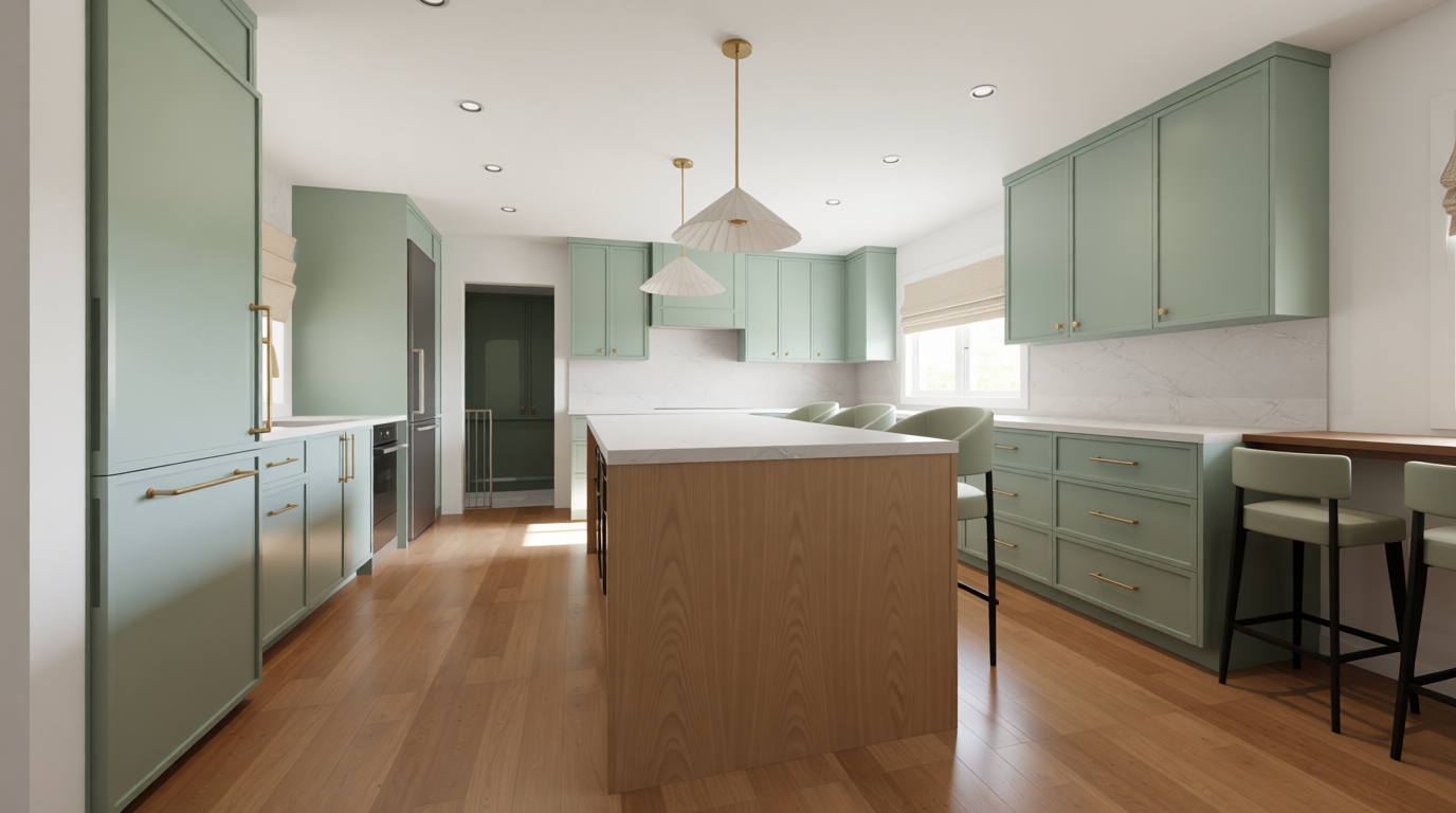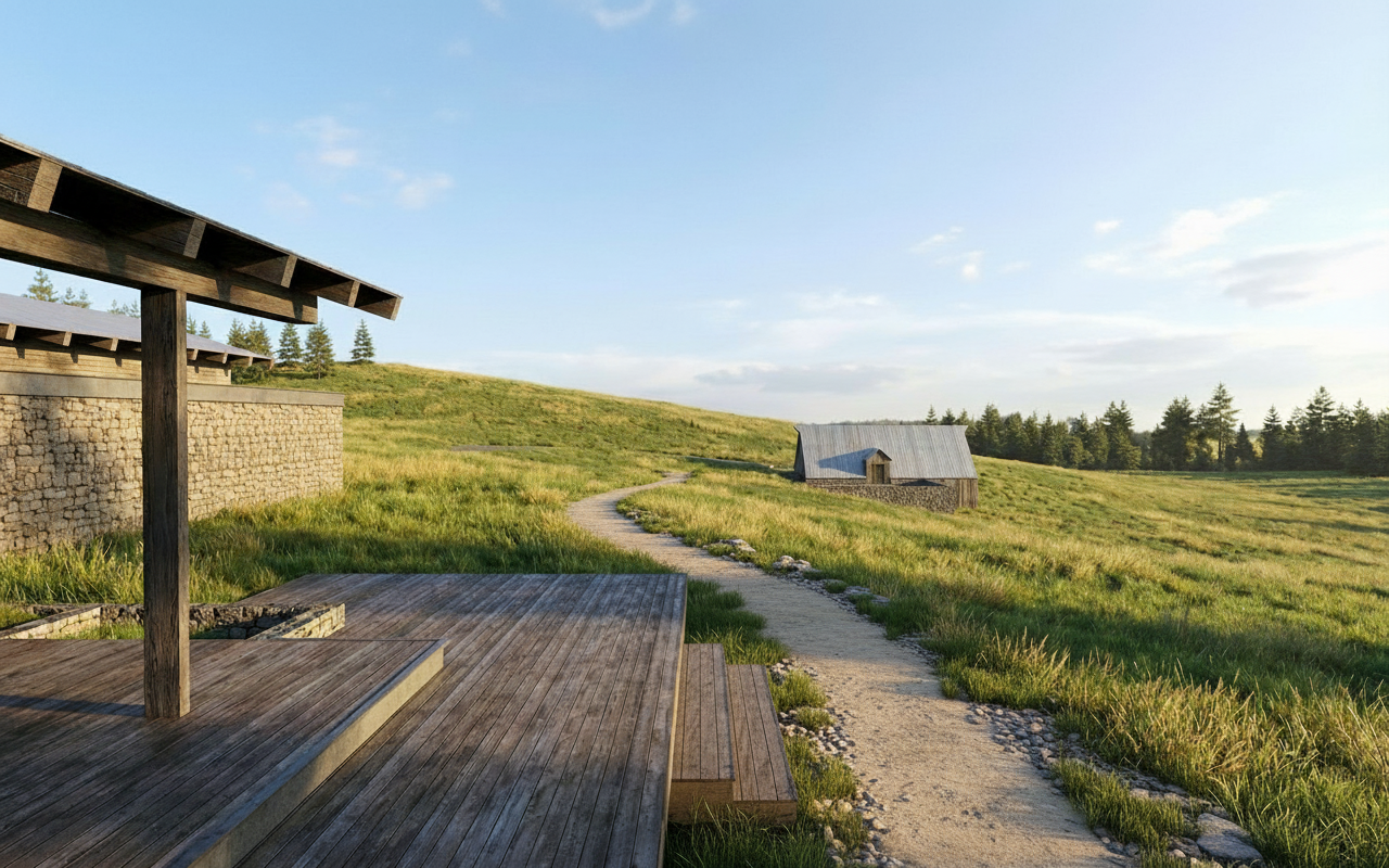 architectural visualization of an open air quincho outdoor barbecue pavilion approximately 4x4 meters cementitious flooring with a strong concrete appearance light to medium gray matte finish black ceramic elements clearly visible and defined strong presence of dark wood elements throughout the project with dark stained wood used in finishes and details structural columns and beams made of metal in deep graphite gray ceiling made of dark pine wood slats rich and warm in tone built in concrete furniture and countertops with a raw minimalist finish emphasizing the contrast with the dark materials behind a dark wood lattice screen a bougainvillea climbing and weaving through the lattice with red colored leaves adding vibrant contrast a person grilling at the built in concrete barbecue subtle smoke rising and several people seated on chairs around a table relaxed and social atmosphere behind the quincho a small patio finished with light gravel shells conchuelas and in the background a vertical dark wood fence modern minimalist chilean residential architecture realistic human scale natural interaction soft natural daylight high detail architectural render style dark all wood