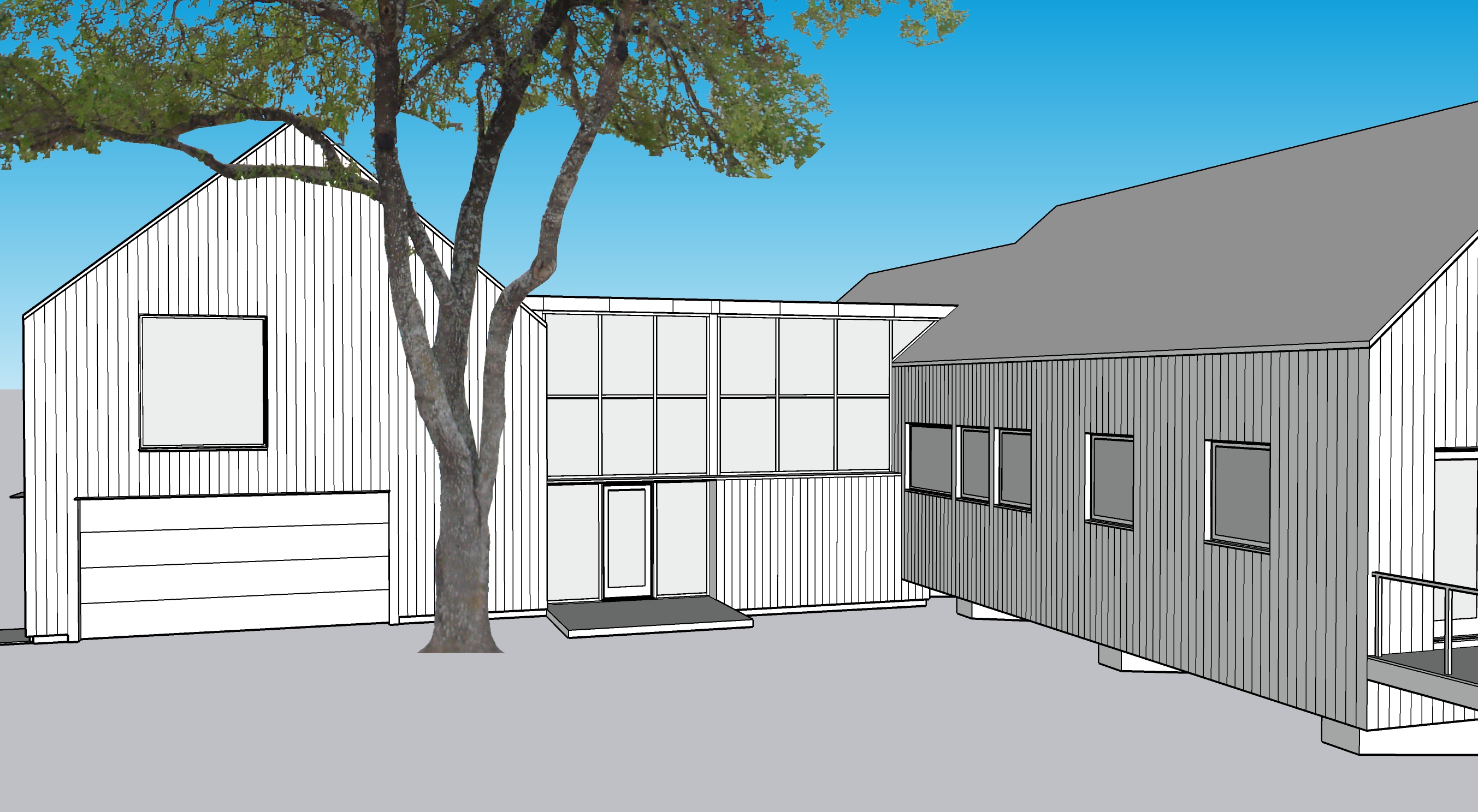 alvar aalto exterior shot exterior siding is clear thermally modified wood like grey natural cedar garage door is a glass door backgrounds is the st croix river looking over the river to the west with trees inn the background too roof is aged zinc standing seam remove green patina copper panels window frames to be dark zinc color architecture