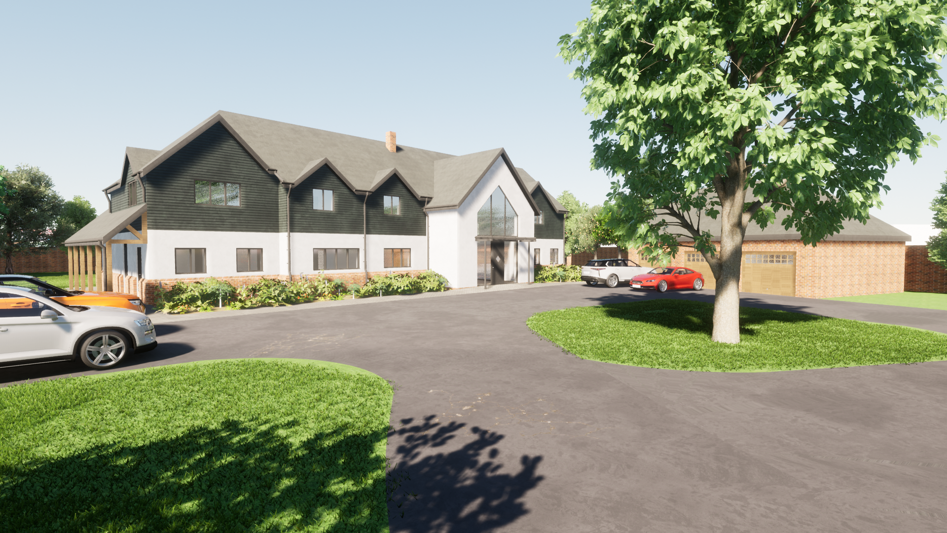 a hyper realistic depiction of a large modern house with dark wood siding and white render the house features a pitched roof and large front windows in front of the house there is a well maintained driveway with three parked cars a white suv an orange vehicle and a red sports car lush green grass and a large leafy tree are in the foreground providing shade the scene is set on a clear day with bright sunlight casting natural shadows