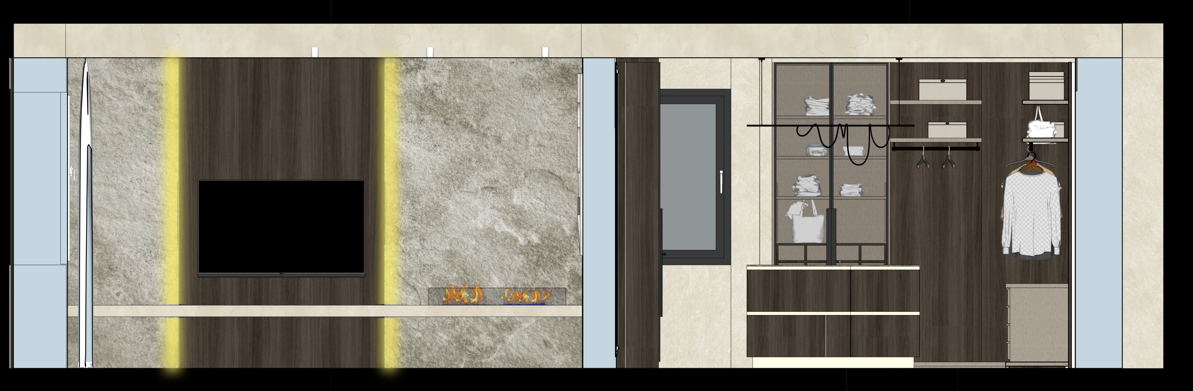 perfetto prompt pronto da copiare prompt eng front elevation architectural render orthographic view no perspective strictly preserve the original image composition maintain exact geometry proportions alignment spacing and dimensions all walls openings furniture fireplace and wardrobe elements must remain identical to the input do not move scale rotate redesign simplify or reinterpret any element do not add or remove objects fireplace flame must remain natural and realistic with soft controlled glow no exaggeration no overexposure and no artificial effect apply only a very subtle warm light influence on nearby surfaces preserve all materials textures colors and finishes exactly as they are do not change tones or design enhance realism slightly without altering identity stone surfaces more tactile with subtle depth wood with richer grain fabrics softer and slightly volumetric matte surfaces clean and realistic maintain wardrobe and shelving elements sharp clean and precisely aligned do not reinterpret objects use soft uniform neutral lighting no dramatic shadows no cinematic lighting no high contrast add only subtle shadow definition and ambient occlusion to improve depth white background only no environment no exterior context clean minimal orthographic architectural render high resolution no artistic reinterpretation