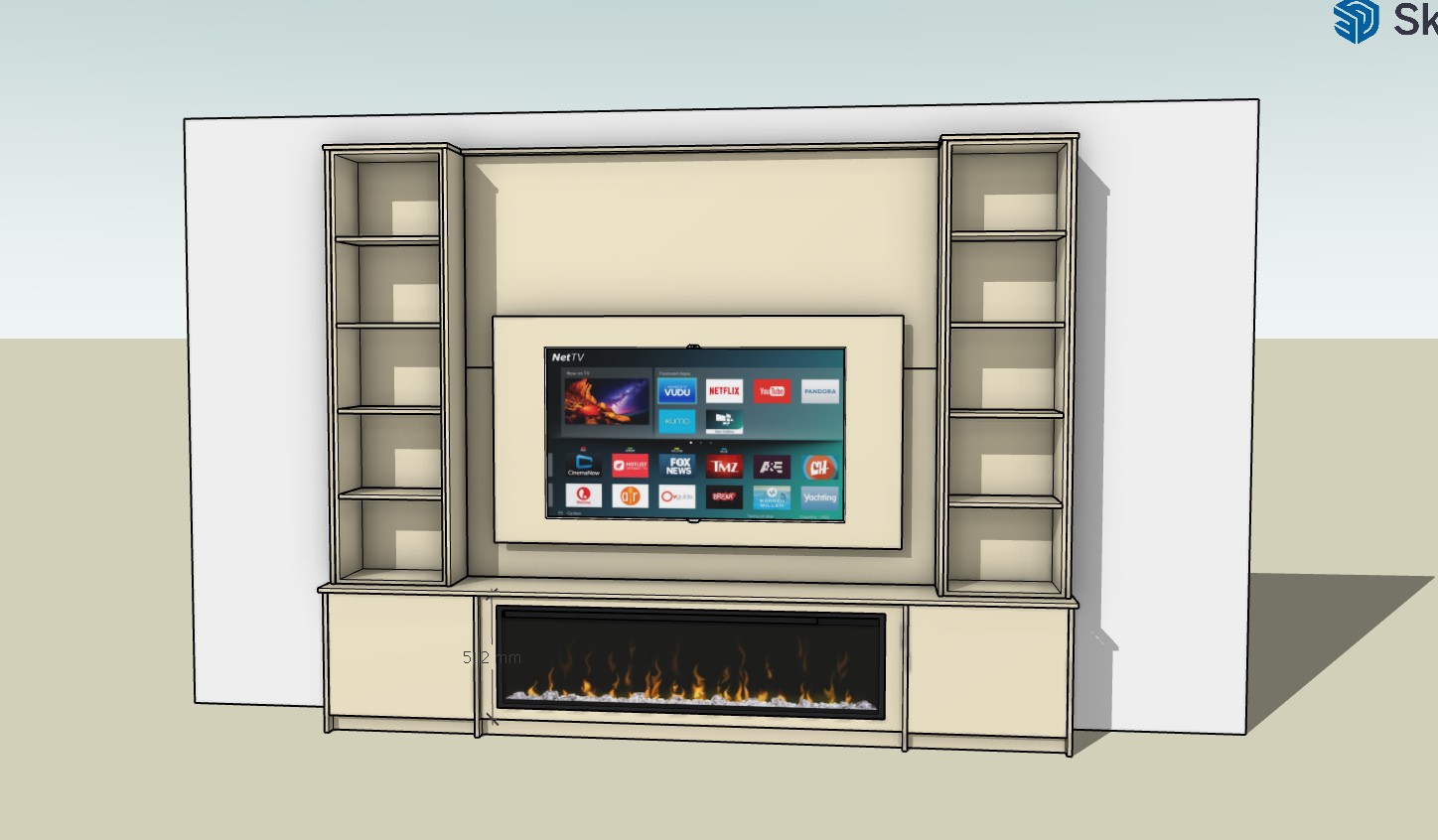 this is a drawing of a ivory coloured tv unit complete with open shelves a 50 fire below the counter top