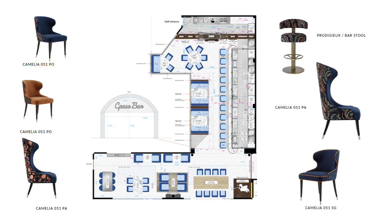 bar with barstools and seating make interiors like its space but neon pinks in graphics on walls and astronaughts