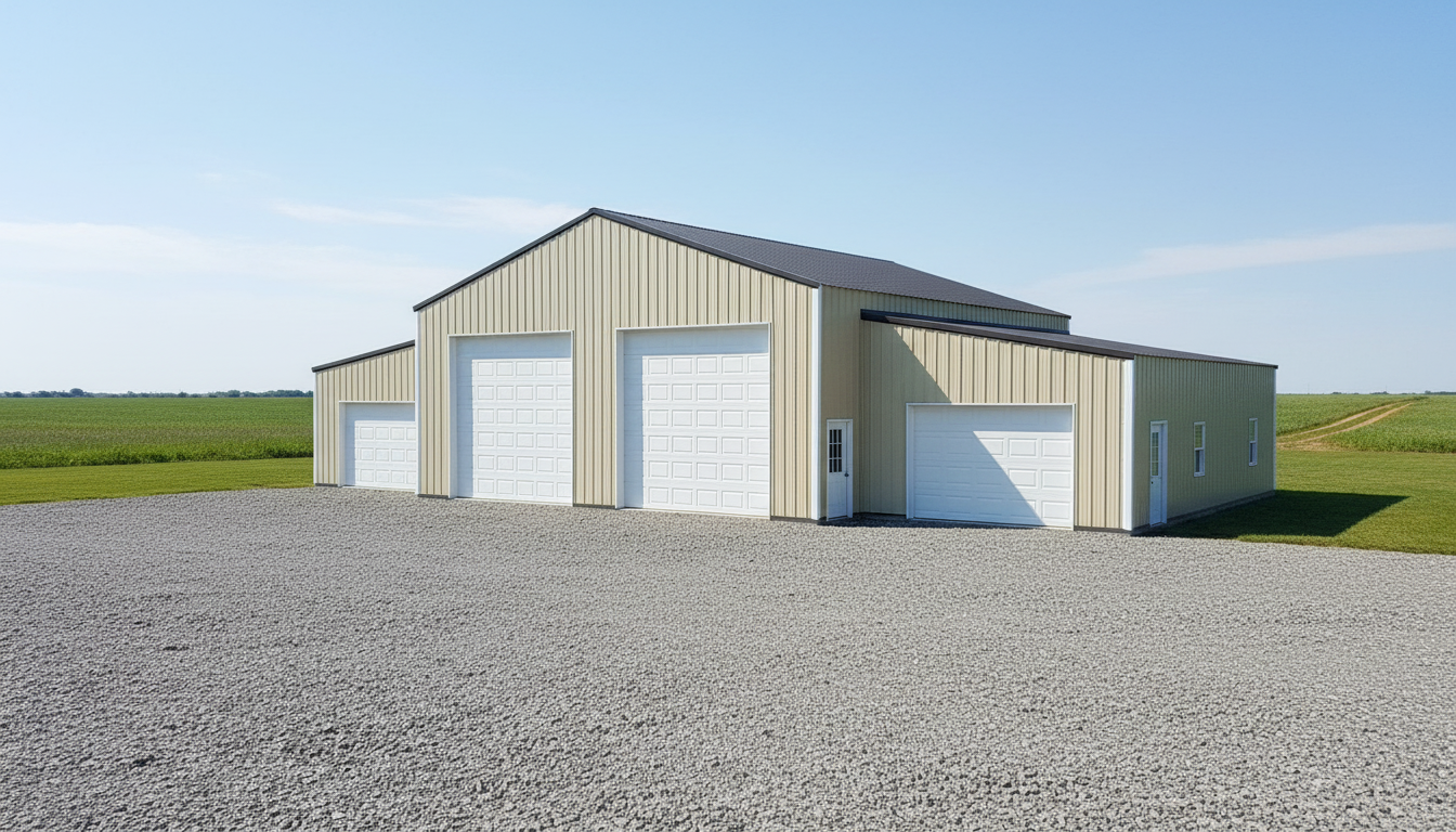 show this building in a yard setting with a field behind it and all gravel parking lot in front of it roof is a burnished slate steel ag panel profile walls are a steel ag panel profile in a light stone color all doors and windows are white and the corners on the building match the roof all trims around windows and doors will match the roof color