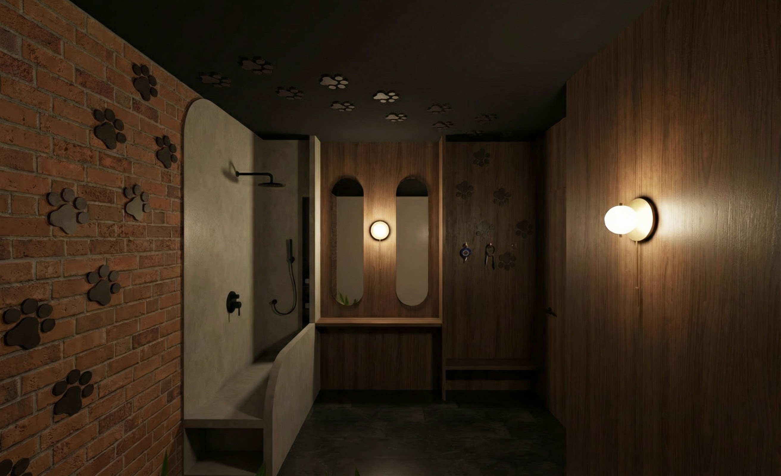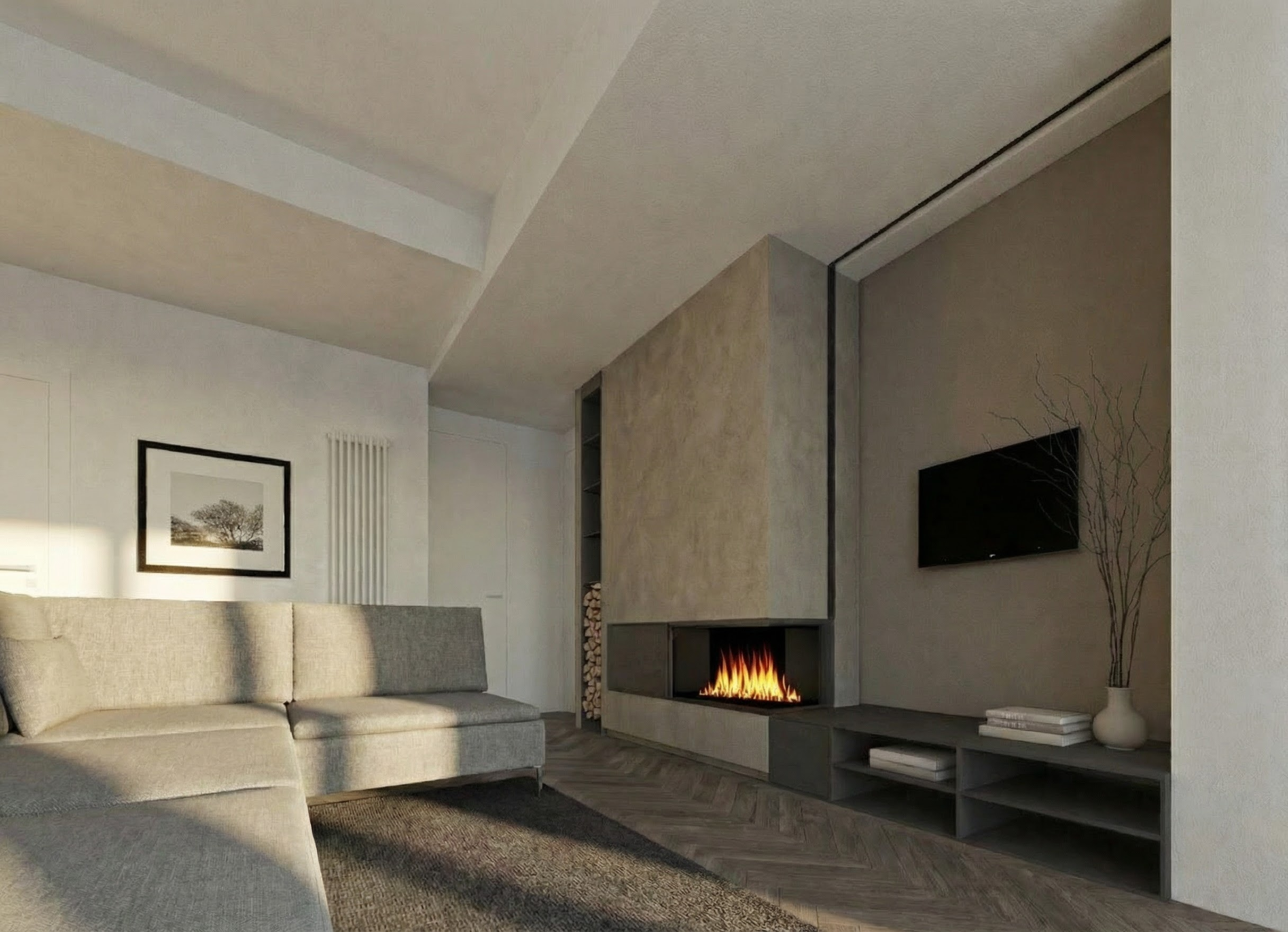 adjust lighting only keep geometry materials and furniture unchanged move the two spotlights above the tv inside the black ceiling groove recessed small spotlights integrated within the slot no visible external fixtures add one small recessed ceiling spotlight between the two doors after the fireplace subtle warm light cone downward keep existing night atmosphere balanced warm lighting no redesign no new objects preserve all