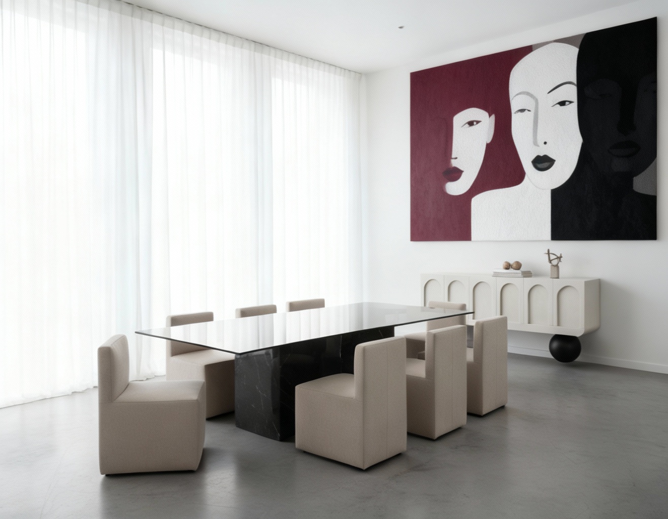remove the plants add a big mirror with golden frame portrait orientation on the wall remove the leafs acessories from the buffet add a brass acessories sculpture on the center of the buffet add a pendant lighting in the shape on wave over the table