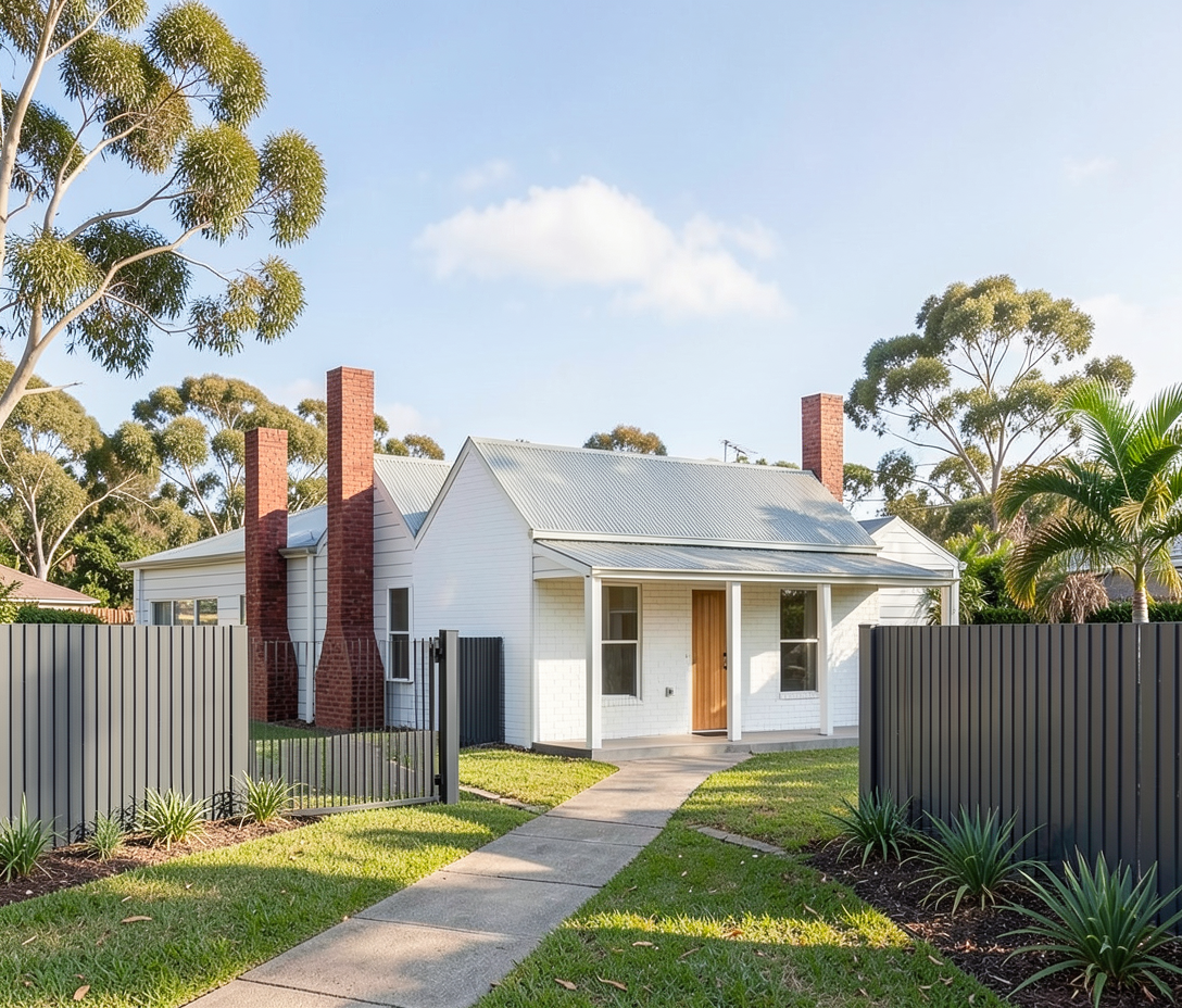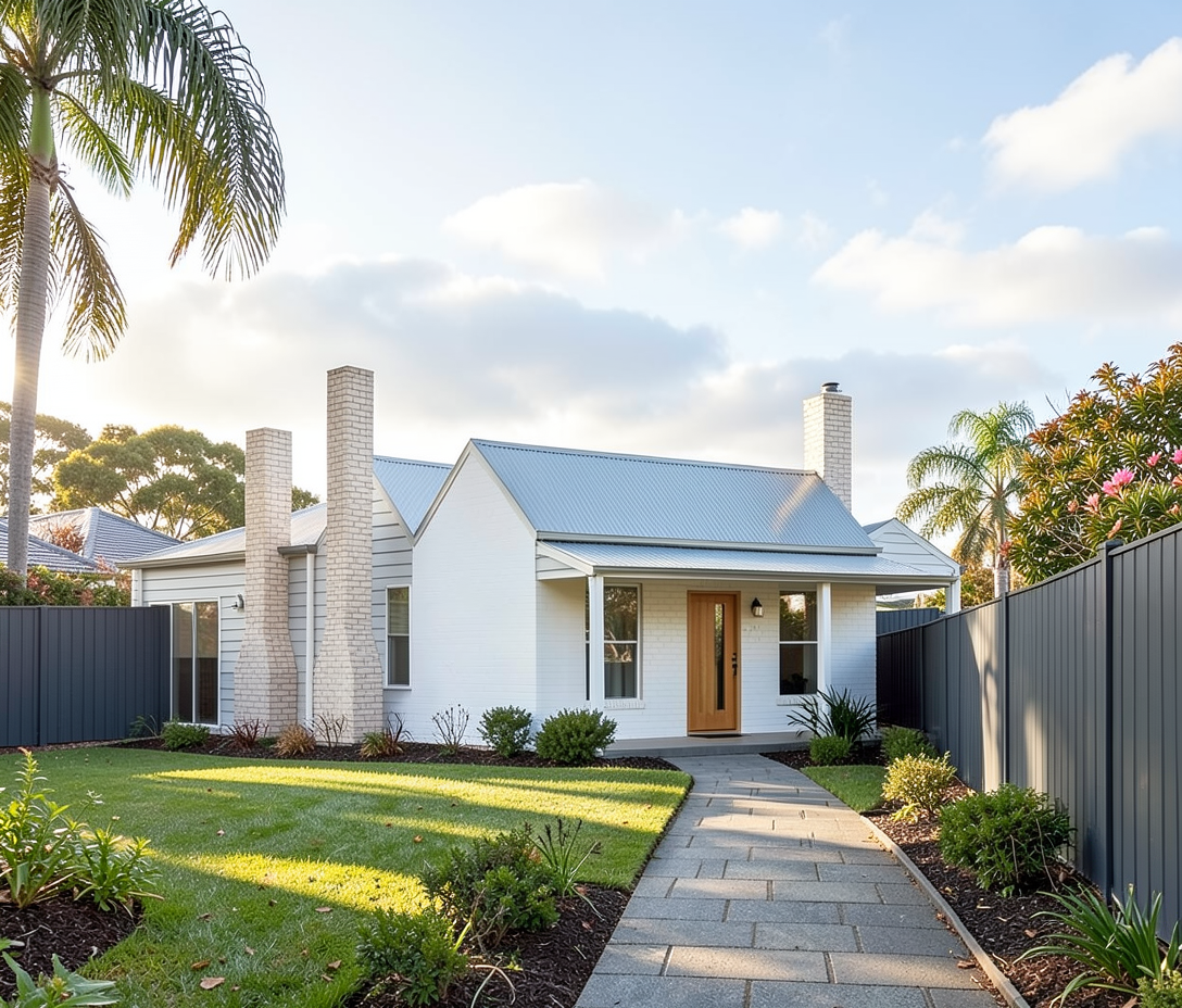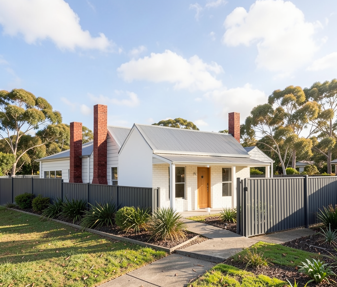 render this in cast stone and buff brick with metal doors the landscape should be grasses all around it and black roofs