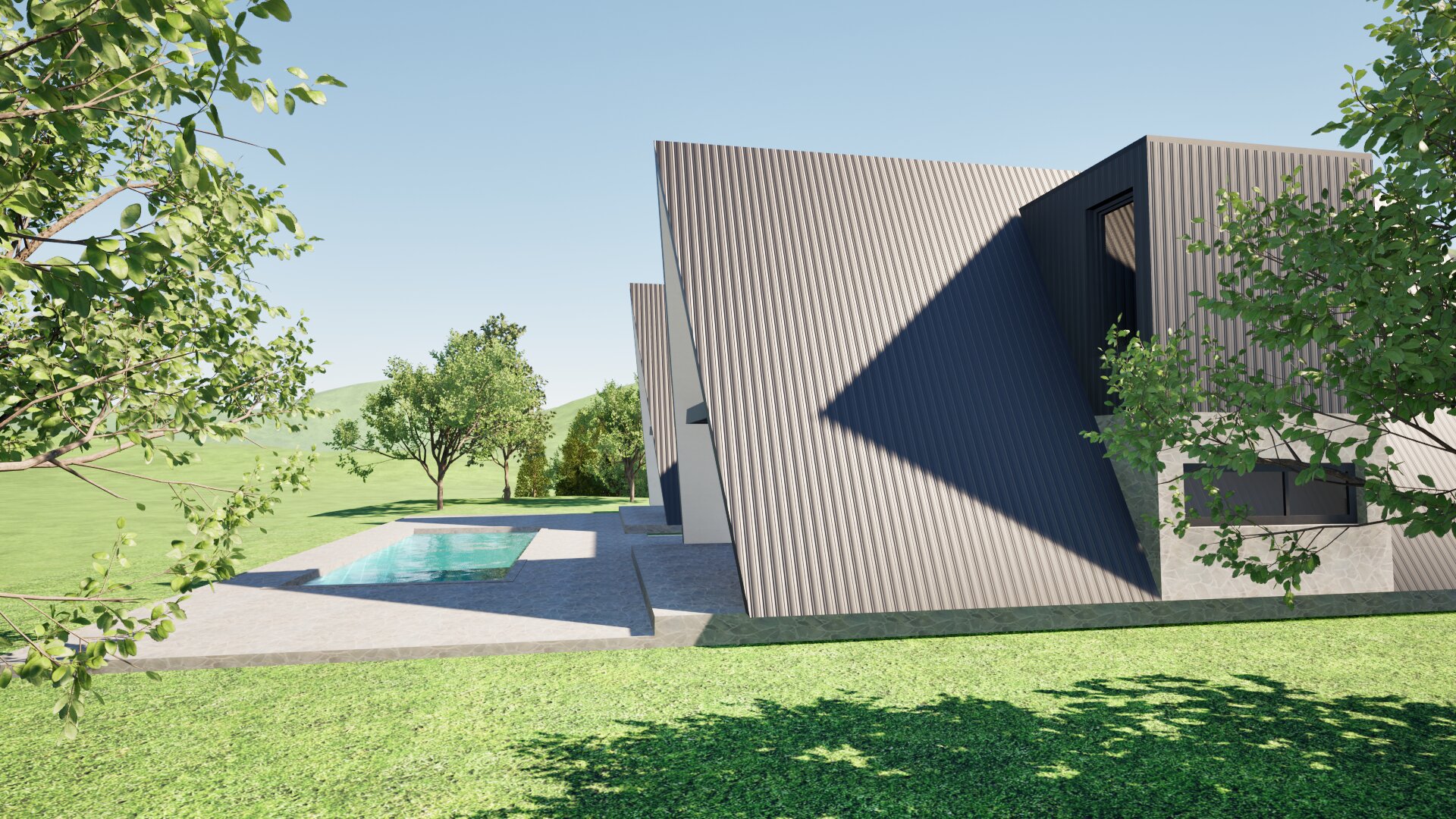 add more realistic details grass and flowers people are swimming and sunbathing pool is 4m brigt and 12m long roof has real aluminium falz