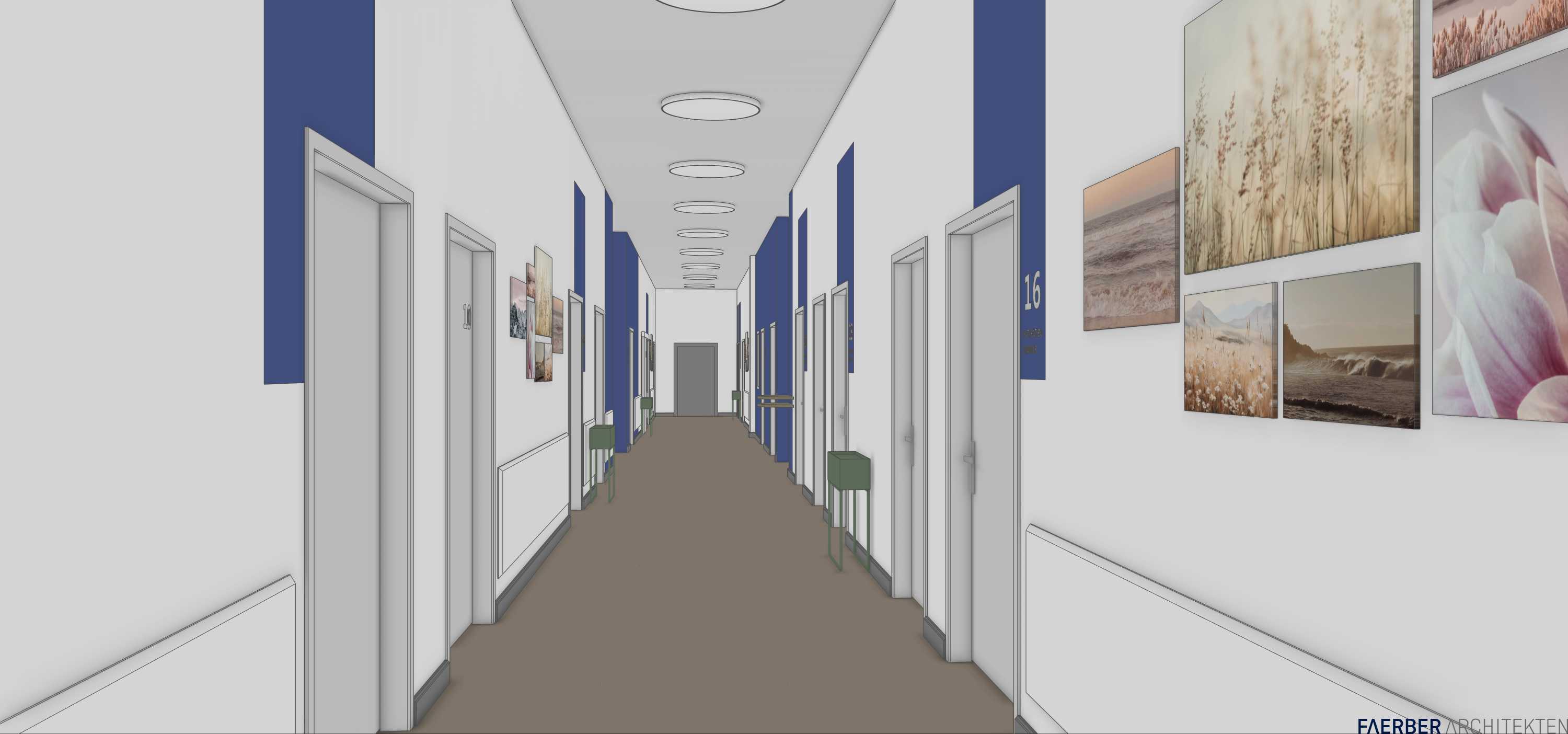 imagine a modern serene hallway in a sophisticated building the walls are primarily white with elegant navy blue accents strategically placed alongside each door to create a rhythmic pattern the polished light gray doors contrast pleasingly against the white walls the floor is a warm earthy brown adding a sense of grounded comfort subtle green plant stands line the hallway merging nature with design the hallway is illuminated by round recessed ceiling lights casting a soft inviting glow artistic photographs in calming pastel and sepia tones are displayed along the walls enhancing the tranquil and cultured atmosphere the overall mood is one of calm elegance and contemporary sophistication the floor is anthrazit inoleum the doors are matte white