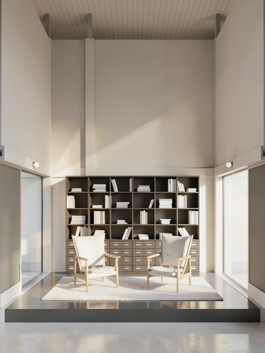 ultra realistic architectural interior render of a minimalist reading lounge with two armchairs facing each other on a rug in front of a dark modular bookshelf filled with books and drawers the space is symmetrical and calm with tall concrete walls and a high ceiling materials are extremely tactile and realistic raw cast concrete with subtle pores and vertical formwork marks slightly uneven plaster wall surfaces matte black lacquered wood bookshelf with soft reflections natural wool rug with visible fibers textured linen upholstery on the armchairs and warm wood details on furniture lighting is cinematic and atmospheric inspired by high end japanese gallery interiors soft warm overhead glow large diffused hanging paper lantern light similar to a japanese rice paper lamp indirect ambient lighting gentle shadows and strong depth add subtle imperfections and realism slight wear on edges varied book textures slight dust micro scratches on surfaces soft reflections on the floor mood is quiet contemplative and monumental similar to a museum or high end design showroom