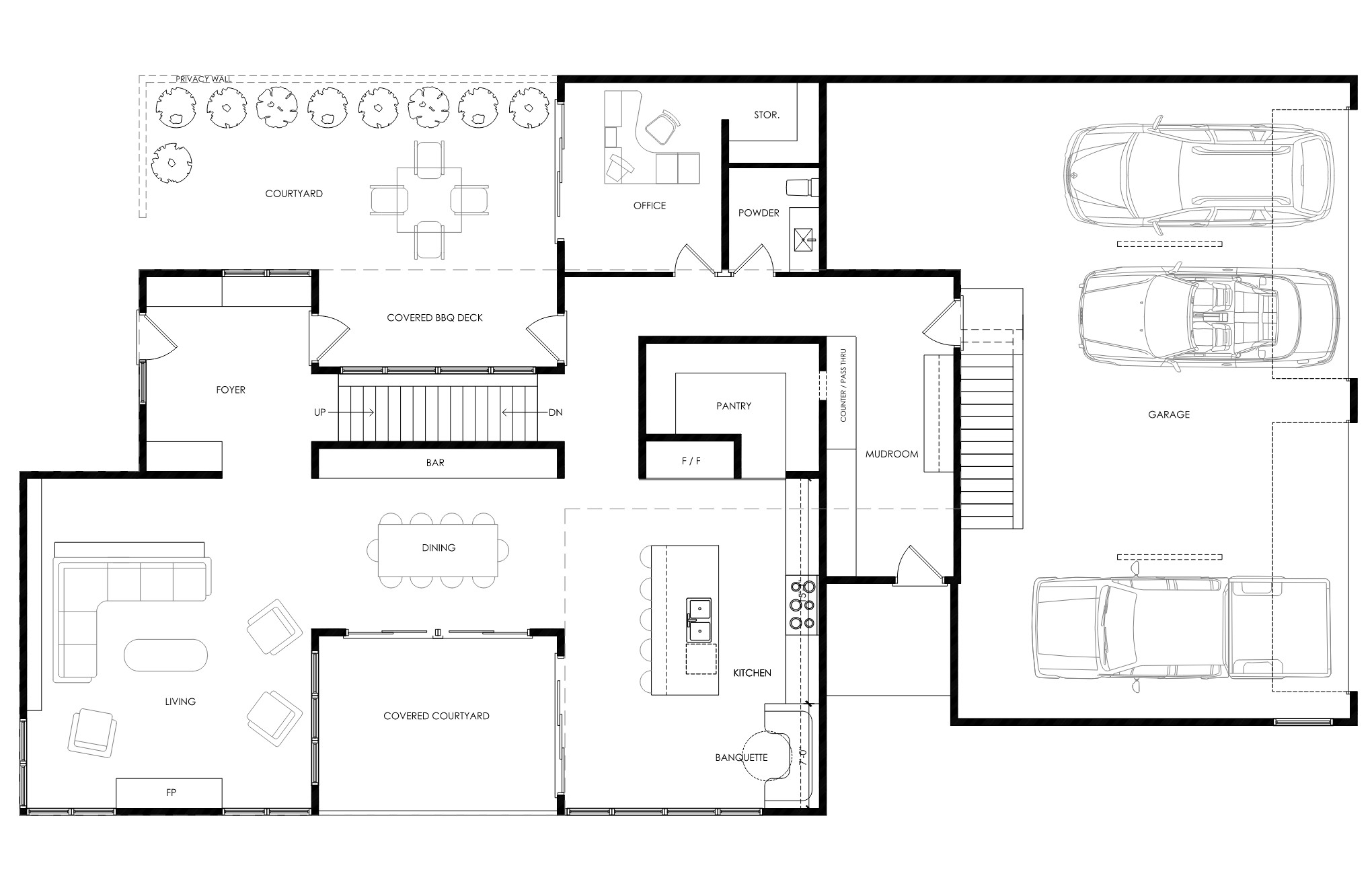 convert this floor plan into a realistic isometric 3d view of a full house show the space from an elevated angle with furniture walls and details visible moody but warm colours large format tile flooring throughout use the same furniture as shows on the plan do not change the orientation of the floorplan