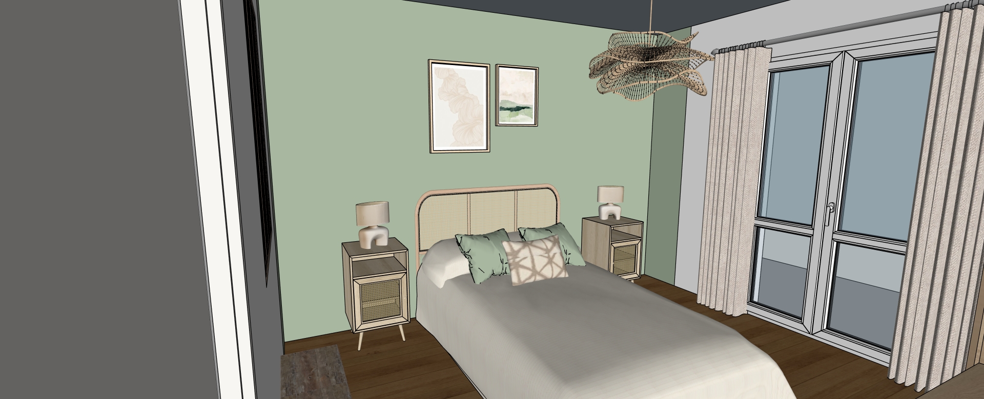 respecter la g om trie et les couleurs par la fen tre on voit un balcon la t te de lit est en cannage la peinture verte du mur du fond continue sur une bande sur le mur de la fen tre comme sur la s lection le mur vert est le coloris bananier de zolpan