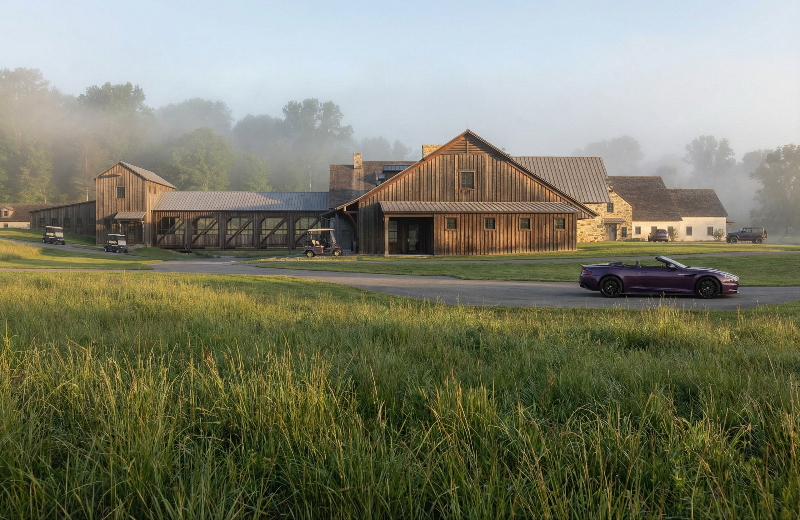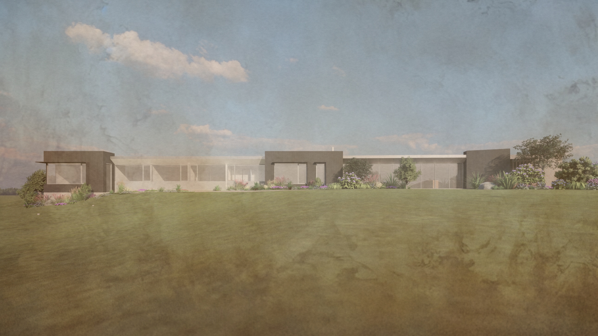 photorealistic architectural rendering of a contemporary australian rural home enhancing an existing lumion base image introduce soft atmospheric depth abundant natural light with a warm low angle sun early morning or late afternoon creating gentle highlights and soft shadows the front of the building needs direct sunlight on an oblique angle refine materiality to feel tactile and true to life dark cladding to be black matte standing seam concrete with natural irregularity and depth metal with subtle reflectivity and imperfections glazing with realistic reflections and slight interior transparency add understated warm interior lighting 2700k 3000k to create a soft glow ensuring it feels natural and not overexposed balance interior and exterior lighting so neither dominates enhance landscaping with slight movement and realism softened edges and subtle tonal variation in grasses and foliage introduce light environmental effects e g faint haze diffused background to increase depth and atmosphere overall mood should be warm calm and evocative slightly ethereal but grounded in realism avoid overly dramatic contrast or stylisation aim for a premium architectural photography aesthetic with a cinematic softness