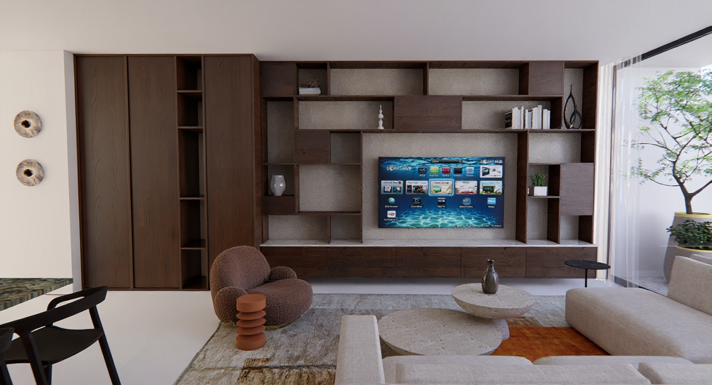 enhance the texture and look of the wooden elements add a linen fabric wallpaper to the wall behind the wooden library make the top of the horizontal tv unit travertine give a dark brown boucle fabric texture to the armchair add an open beige vase with burgundy flowers on the coffee table make the image look more realistic