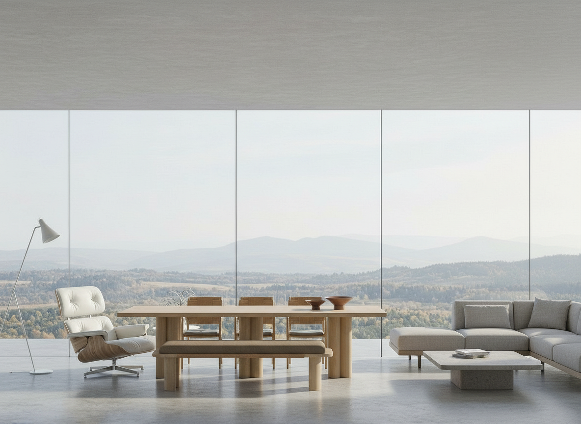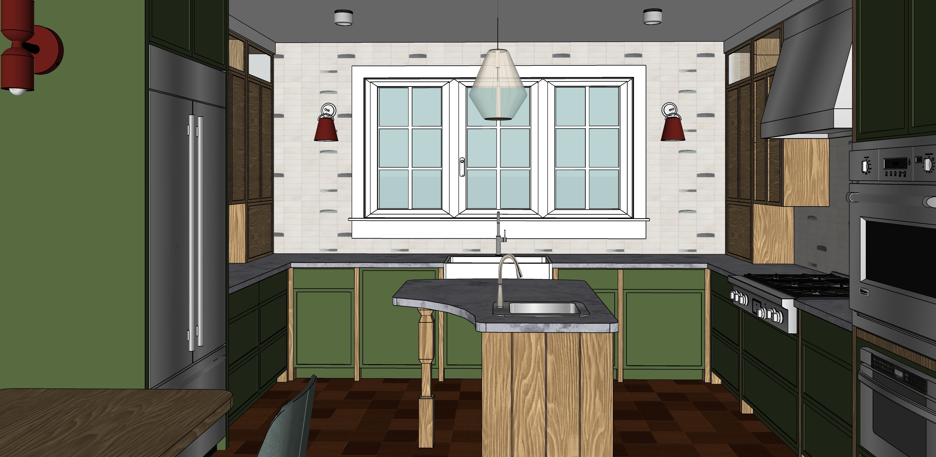 transform the provided kitchen interior image into a high end photorealistic render with warm golden hour atmosphere soft glowing highlights and relaxed upscale coastal energy while keeping everything exactly the same keep the same proportions same materials and same spatial configuration do not move or alter any objects geometry textures colors or furniture positions the green cabinets should appear the same as the benjamin moore color martha s vineyard 630 the wood cabinets should appear the same as stained white oak the countertops should appear as marble grigio carnico the cabinet glass should appear the same as as opaque fluted glass the flooring should appear the same as terra cotta the tile should appear the same the appliances and range hood should appear the same as stainless steel the lighting should emphasize golden hour warmth gentle reflections soft shadows enhanced color richness and luxurious catalog level realism improve depth and realism through wood grain richness marble shine brass highlights fabric texture and polished clarity while keeping the entire scene exactly as originally designed outside of the window should appear as california coastal live oak trees with dappled sunlight