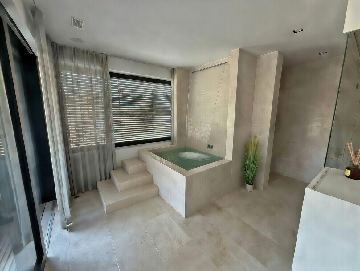 genau dieses rendering berarbeiten fotorealistisches innenraum foto exakt dieselbe perspektive und kameraposition wie das hochgeladene referenzbild links beim fenster sch ne moderne topfpflanze wanne etwa einen halben meter h her machen sehr h bsche asiatische frau um 25 im tauchbecken 100 identische raumgeometrie weiches nat rliches tageslicht mit schatten von jalousien an den w nden raum zus tzlich k nstlich ausleuchten sanfte realistische schatten realistische materialien hochwertige oberfl chenreflexionen nat rliche farbwiedergabe golden hour feeling hell ausleuchten das bild muss wie eine professionelle fotografie aussehen es soll ein echtes und reales foto sein canon eos r5 35 mm festbrennweite f 2 8 hyperrealistisch dslr qualit t raw aufnahme 8k aufl sung extrem scharf perfekte tiefensch rfe professionelle architekturfotografie