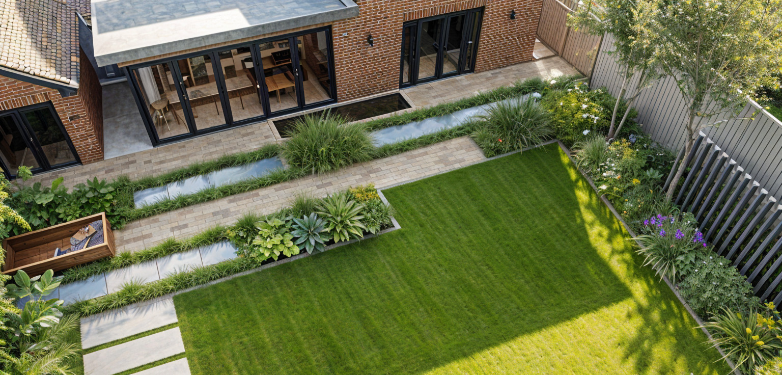 keep image as the same but change timber planter on left side of image to a rusted corten steel water feature same size change garage roof to slate make aluminium roof of extension a darker grey change pond in the middle to a low planted bed