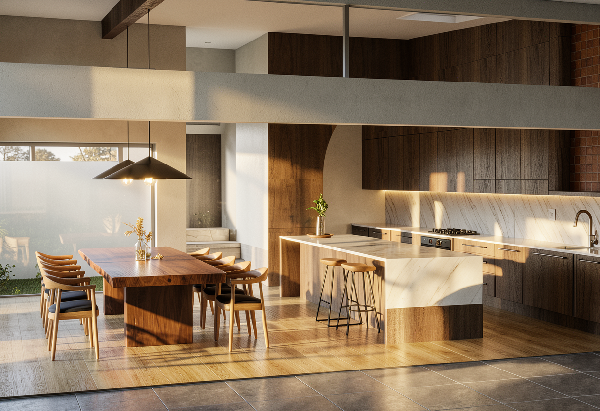 remove the bar stools on the left add the bar stools from the reference image to the right side and make the island longer and in wood