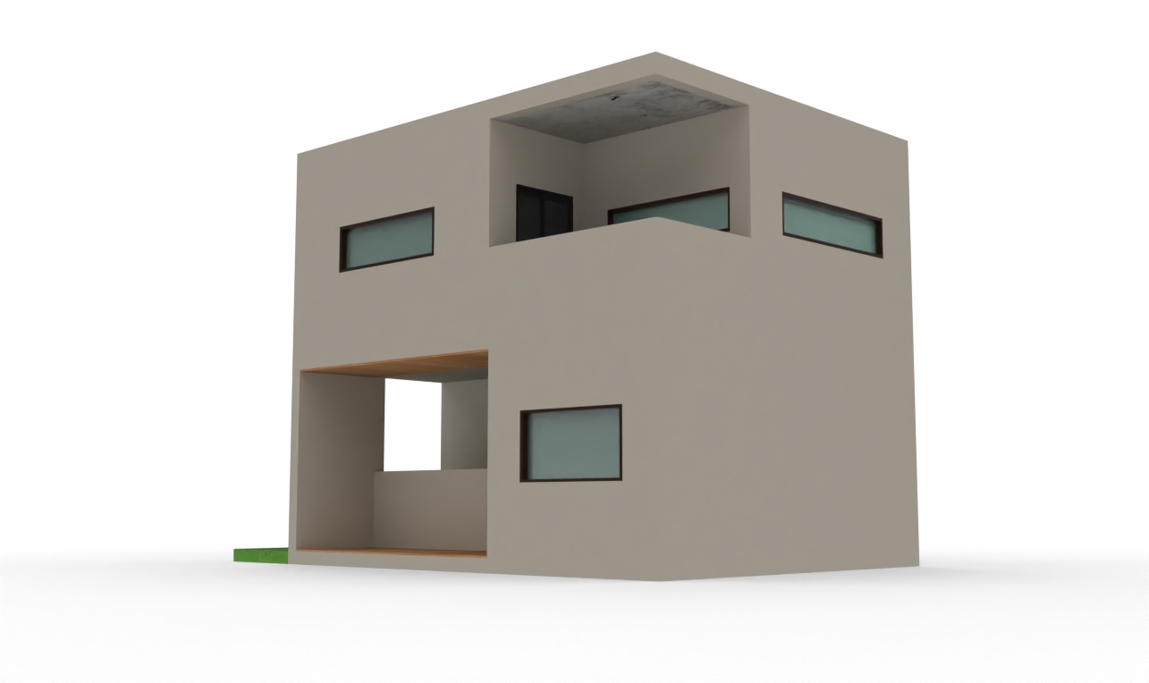 imagine ultra realistic architectural exterior rendering of a two story accessory dwelling unit adu minimalist tropical modern architecture monolithic stucco or concrete mass strong cubic form minimal openings tall vertical slit window emphasizing wall thickness carved ground level entry void recessed into the mass deep shadows expressing enclosure flat roof with clean parapet edge inward focused design prioritizing privacy smooth plaster texture with subtle imperfections restrained material palette sparse ground plane neutral daylight soft shadows eye level perspective professional architectural visualization raw realism ar 4 3 style raw
