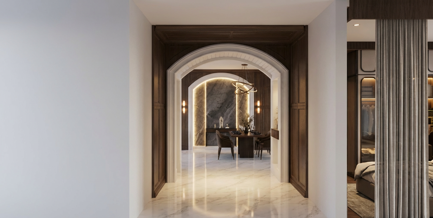 crea un render fotorealistico di questa vista 3d si tratta di una sala da pranzo che guarda verso una cucina la cucina quella dell immagine di riferimento utilizza gli stessi materiali e geometrie dell immagine per la cucina la sala da pranzo ha le pareti e boiserie bianche una tavolo in legno moderno e sedie comode e moderne il pavimento in parquet in noce caldo a spina italiana
