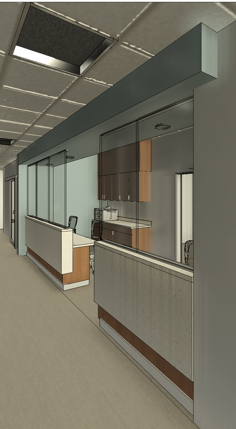 modern nurse station with glass dividers in front of the desk the floor is a blonde wood vinyl plank the space has no sunlight in it