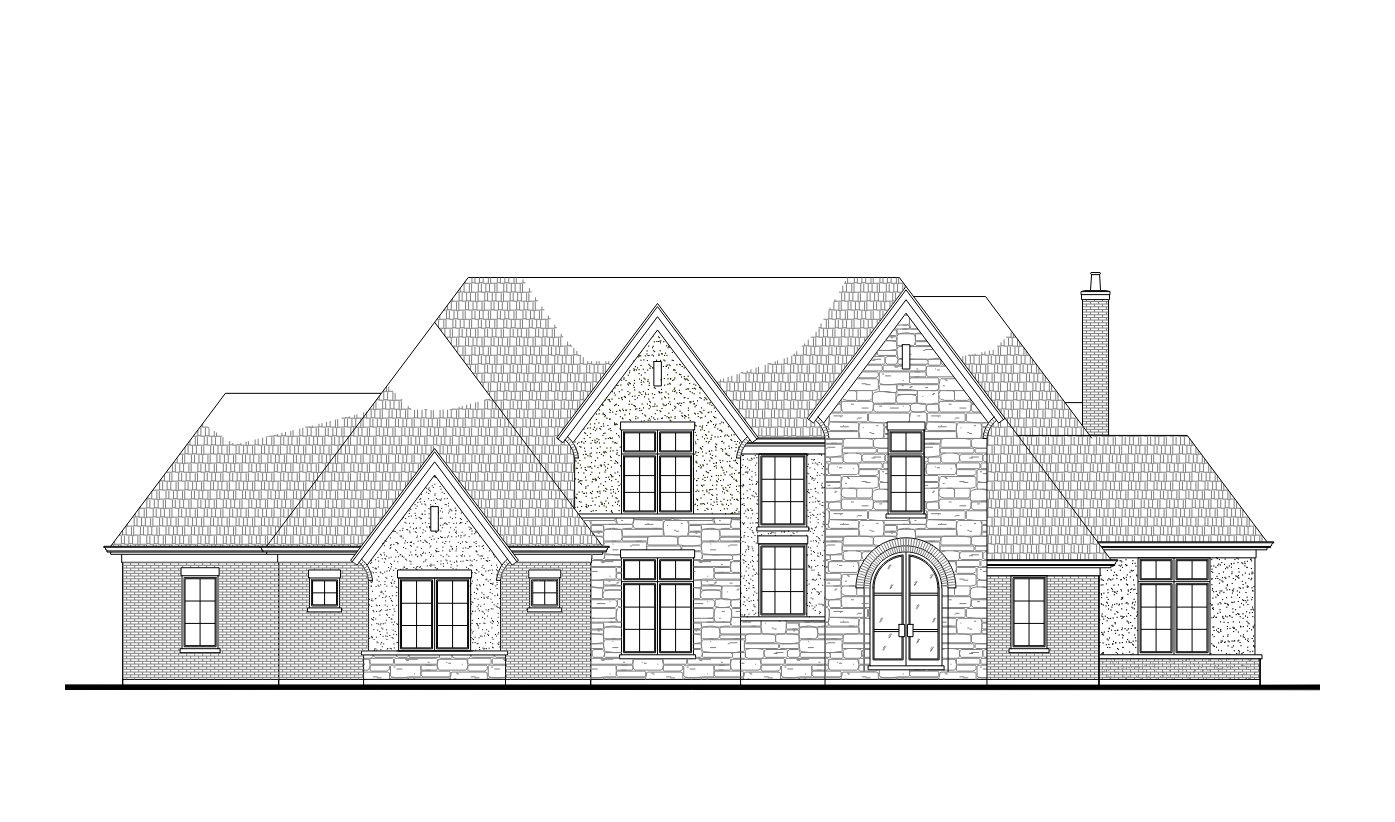 a front elevation view of an elegant residential building with light tan stucco warm color stone and beige brick set at sunset with clouds in the sky the interior should have soft glowing white lighting the roof should be dark gray shingles the window frames should be black metal the landscape should show large trees in the background a few small bushes and flowers in the foreground do not change the angle of view do not change any of the geometry