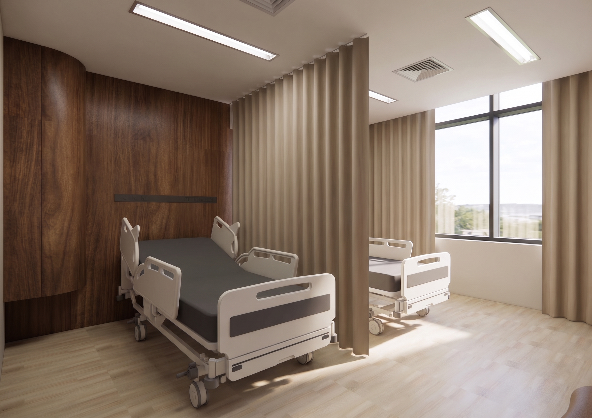do not change any existing geometry create an architectural plan drawing of the site around my building the blue color that is on the left hand side of the image is meant to be water in the form a river the building is the white square with the white rectangles around it do not change the building in any way place a small parking lot above the white building do not put parking anywhere other than above the white building add any landscaping to make the parking lot look appealing the purple material is meant to be the asphalt of the existing street do not change the shape of the existing street the green areas are medians in between the road where there needs to be some trees and other plants the remaining central gray portion needs to be turned into a cool park with an outdoor classroom the yellow lines in the bottom right corner need to be train tracks