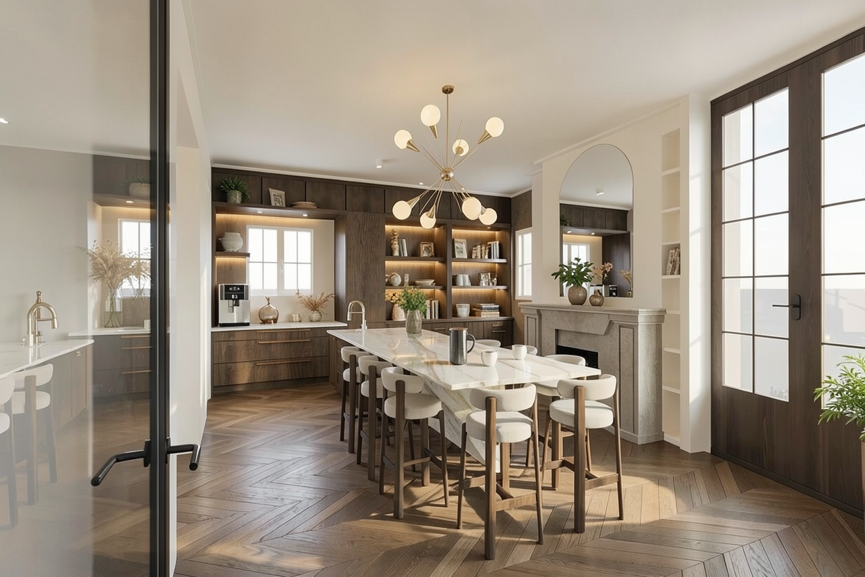 a highly realistic architectural photograph of a mediterranean residential property with three houses arranged side by side the left and right buildings have light yellow colored concrete plaster exterior walls while the middle building features terracotta colored concrete plaster exterior walls all building walls have natural soft matte colors with visible concrete texture not shiny or glossy window color constraint all windows must be white only onespecific window is dark brown one front facing window left building no other windows are allowed to be dark brown or any other color do not change or reinterpret this rule traditional terracotta tile roofs on all buildings the existing tree should be an olive tree maintaining its original position and scale the tree should have natural matte foliage not shiny or glossy do not add any extra trees or objects replace the already existing plants in front of the houses with lavender preserving their exact position and layout include only one stone flower bed around the olive tree replace stones with irregular natural shaped stones not uniform or perfectly cut do not add any extra flower beds keep the ground surface with a mix of grass and stone tile paving as in the original image preserve the ground floor pergola with its tile roof exactly as it is without any modifications bright natural sunlight at 10 am coming from the left casting soft realistic shadows blue sky with scattered clouds in the distance a calm sea visible on the horizon adding depth to the background calm village residential atmosphere keep original details from the uploaded image preserve all architectural elements and maintain the exact same camera angle and composition without any changes do not generate any extra buildings remove building on the right after olive tree extremely photorealistic architectural photography natural light behavior realistic textures visible concrete material detail subtle imperfections no stylization 8k resolution sharp focus wide angle lens professional composition true to life materials
