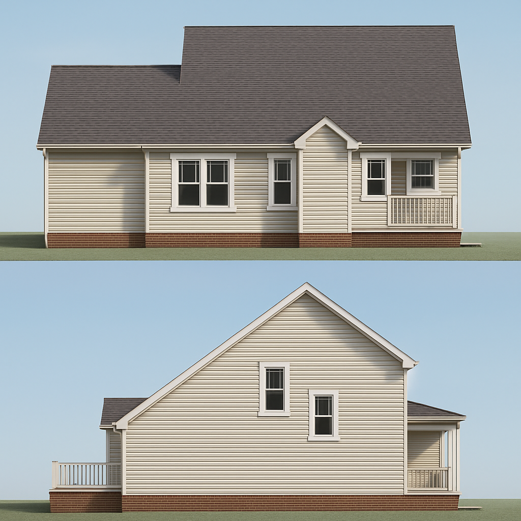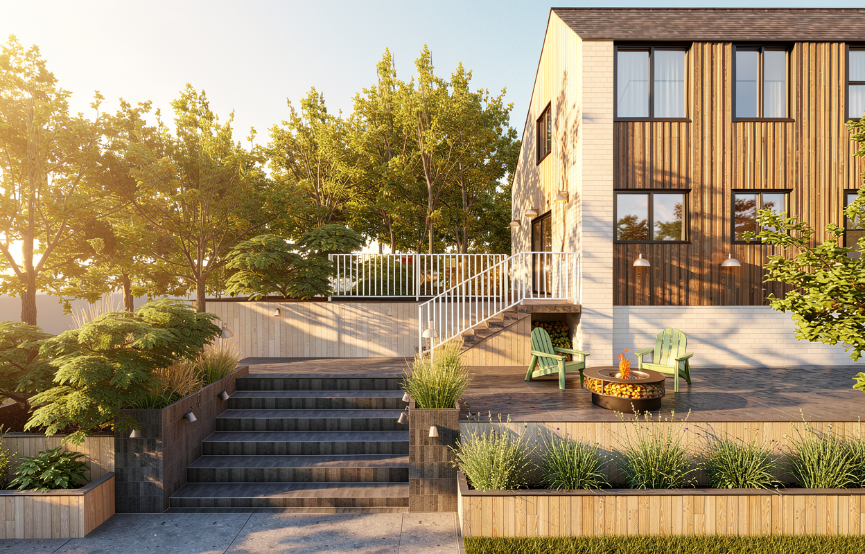 the house sits up on a small grassy hill there is a neighbor to the right and we can see the side of their house there is a 6 foot tall wood fence separating the house from the neighbor on the right there is a large oak tree located at the base of the small hill the house is clad in red brick the windows have black window frames with black metal trim between the windows and reflective glass the roof eave trim and gutters are painted white and there is a black shingle roof exposed structural posts beams and framing are stained dark brown and there is a black iron railing around the porch the time of day is sunset and there are clouds in the sky above the house there are snow capped mountains