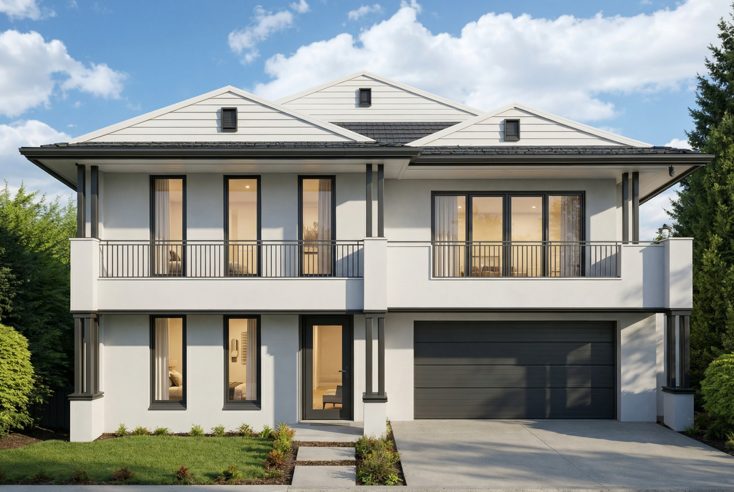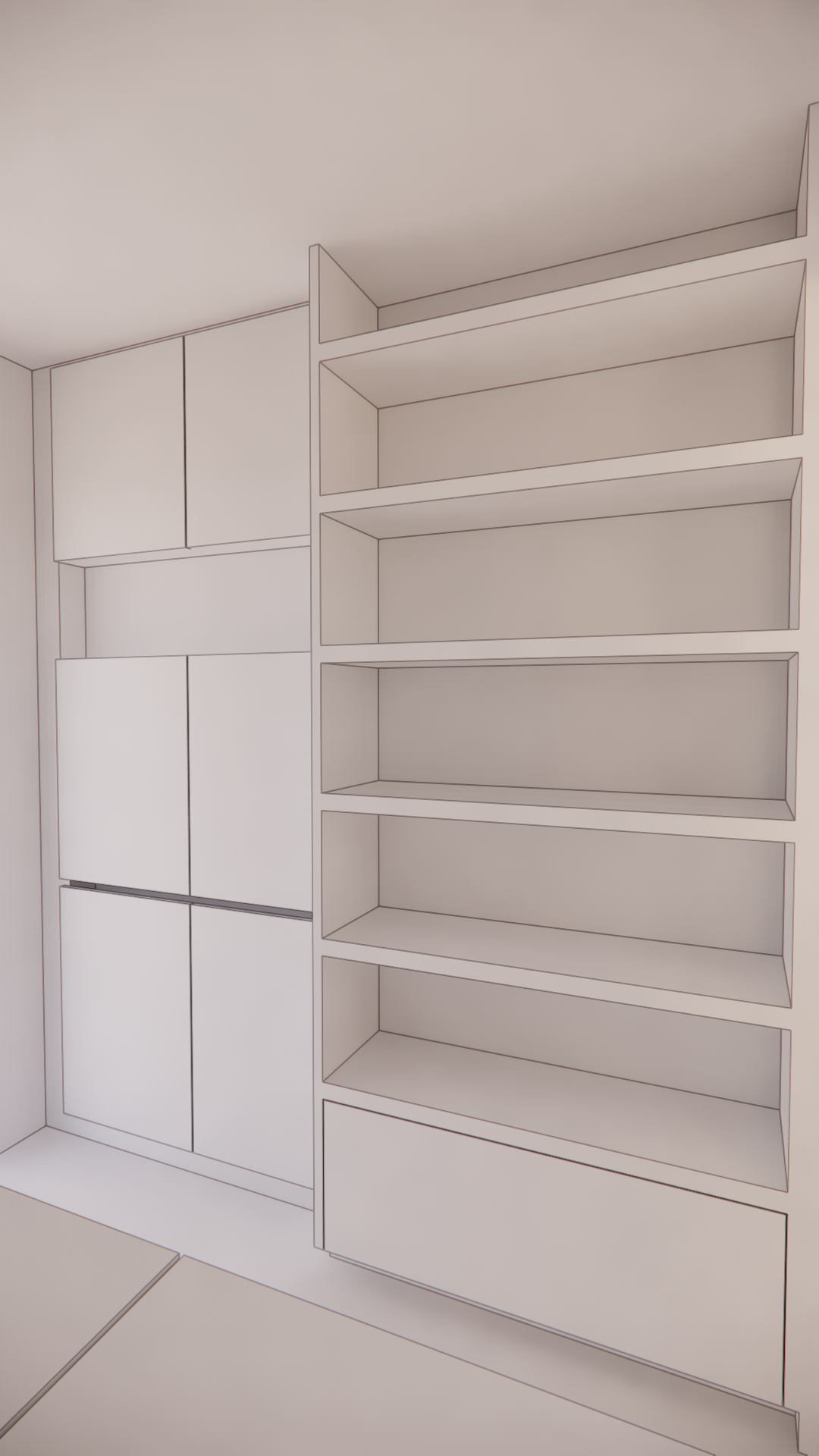 modern interior shot photorealistic 3d render of a modern built in laundry storage wall in a soft grey and white colour palette contemporary australian minimalist design on the right full height open shelving in matte mid grey finish with clean square edges styled with neatly folded white towels woven baskets glass storage jars and minimal decorative objects subtle led strip lighting integrated beneath selected shelves creating a warm ambient glow on the left built in handleless cabinetry with matte light grey polyurethane doors and drawers shadow line finger pulls and a seamless integrated finish overhead cabinets aligned cleanly with lower storage walls are half tiled light grey large format porcelain tiles to 1200mm height with smooth painted wall above in a slightly lighter warm grey tone matching light grey tiled floor with subtle grout lines soft diffused natural light combined with warm recessed ceiling downlights realistic material textures soft shadows slight reflections on cabinet surfaces architectural interior photography wide angle lens 20mm high resolution ultra realistic materials architecture
