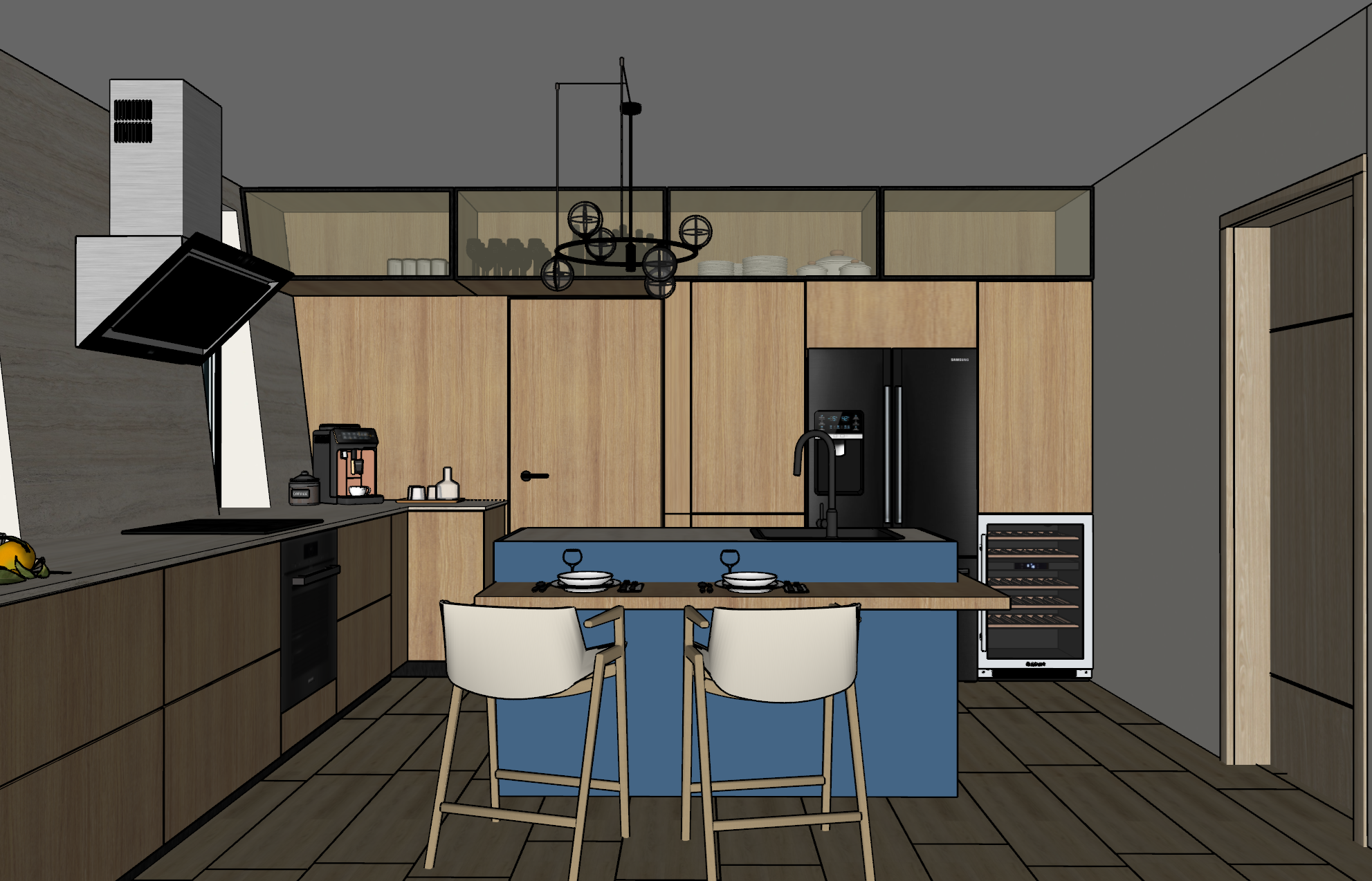task create a highly photorealistic architectural interior render of the provided kitchen scene while preserving exact geometry furniture placement object placement camera angle and architectural layout from the reference image enhance only materials realism lighting quality and subtle lived in details do not change the design proportions or layout camera position the camera is positioned frontal toward the kitchen with a slightly adjusted angle compared to the previous view visible composition includes full height oak cabinetry wall hidden integrated door in the cabinetry upper glass front display cabinets blue island in the center attached dining counter in the foreground two bar chairs black fridge and wine cooler black angled hood on the left suspended chandelier above the island side door on the right the camera must remain exactly aligned with the reference image overall scene character the kitchen should feel modern warm elegant subtly lived in organized but not sterile the realism should come from materials micro details and carefully placed everyday objects not clutter cabinetry main cabinetry wall material natural light oak veneer characteristics vertical wood grain matte finish warm natural tone clean modern flat panels the central door is a hidden integrated door within the cabinetry wall and must remain flush and visually continuous with the surrounding panels lower left cabinetry material dark stained wood veneer characteristics richer darker tone than the tall cabinetry matte finish subtle wood grain do not change cabinet layout upper glass display cabinets upper cabinets have glass fronts with dark thin framing the inside should feel lived in but curated add and preserve a few realistic objects in each compartment such as stacked ceramic plates bowls cups and mugs a few drinking glasses 1 2 serving pieces 1 2 minimal decorative kitchen objects rules keep compositions airy avoid clutter neutral colors only white beige grey smoky glass objects should be organized and believable the glass should show subtle reflections and slight transparency island the island is finished in matte blue board pal characteristics soft desaturated medium blue smooth matte finish clean sharp geometry do not change the island volume or proportions countertops the countertop is light in color material light composite stone or light natural stone characteristics pale warm grey beige tone matte or satin finish subtle natural texture soft realistic reflections this includes island countertop attached dining counter surface main working countertop on the left the countertop must read as lighter than the floor and cabinetry dining counter attached to island a wood counter extension is attached to the island material light natural wood matte finish soft grain visible table setting should remain simple and lived in two plates bowls glasses cutlery placed neatly chairs two bar dining chairs at the counter characteristics light upholstered seat and back pale wood frame soft matte finish they should feel elegant and residential appliances refrigerator matte black finish double door format realistic subtle reflections wine cooler glass front visible bottle racks inside subtle interior darkness clean premium look oven black glass front integrated into the lower cabinetry hood the hood on the left is angled and silver material matte black or satin black finish clean minimal form sink and faucet the sink is integrated into the island faucet black finish modern curved geometry matte or satin surface the sink area should remain clean and realistic left countertop objects the kitchen should feel lived in with a few believable everyday items visible objects may include coffee machine small coffee canister container tray with small bottles or cups fruit or vegetables near the far left a few subtle kitchen essentials these items must feel intentional and restrained not cluttered chandelier the chandelier is suspended above the island design black metal structure circular frame composition multiple glass globes visible bulb holders and visible bulbs inside characteristics sculptural modern airy transparent glass reflections the bulbs should be clearly visible inside the globes doors hidden cabinetry door must remain fully integrated in the cabinetry wall right side door modern interior door with light wood finish black horizontal detail lines clean minimalist appearance floor flooring large plank wood flooring characteristics medium warm wood tone visible wood grain matte finish subtle tonal variation between planks do not reinterpret layout or plank direction lighting use soft natural daylight as the main source characteristics balanced daylight entering from the left side window even illumination across the kitchen soft shadows no dramatic contrast artificial lighting may be very subtle and secondary only enough to make the chandelier glass and interior materials feel realistic but the scene should still read primarily as daylit lived in realism important the space should feel inhabited but refined add only subtle everyday realism such as curated dishes in vitrines coffee setup in use simple table setting minimal countertop accessories slight material imperfections soft contact shadows faint fingerprints or realistic surface variation on darker appliances do not overdecorate do not add random objects do not create clutter material realism enhance oak wood grain darker wood cabinetry texture matte blue island finish light countertop softness black appliance reflections chandelier glass reflections ceramic and glass realism in vitrines subtle fabric texture on chairs render style high end residential interior photography style references archdaily dezeen premium kitchen catalog photography contemporary european residential interiors characteristics photorealistic balanced exposure clean composition subtle luxury calm realistic atmosphere negative prompt do not change layout move furniture modify cabinetry geometry cha