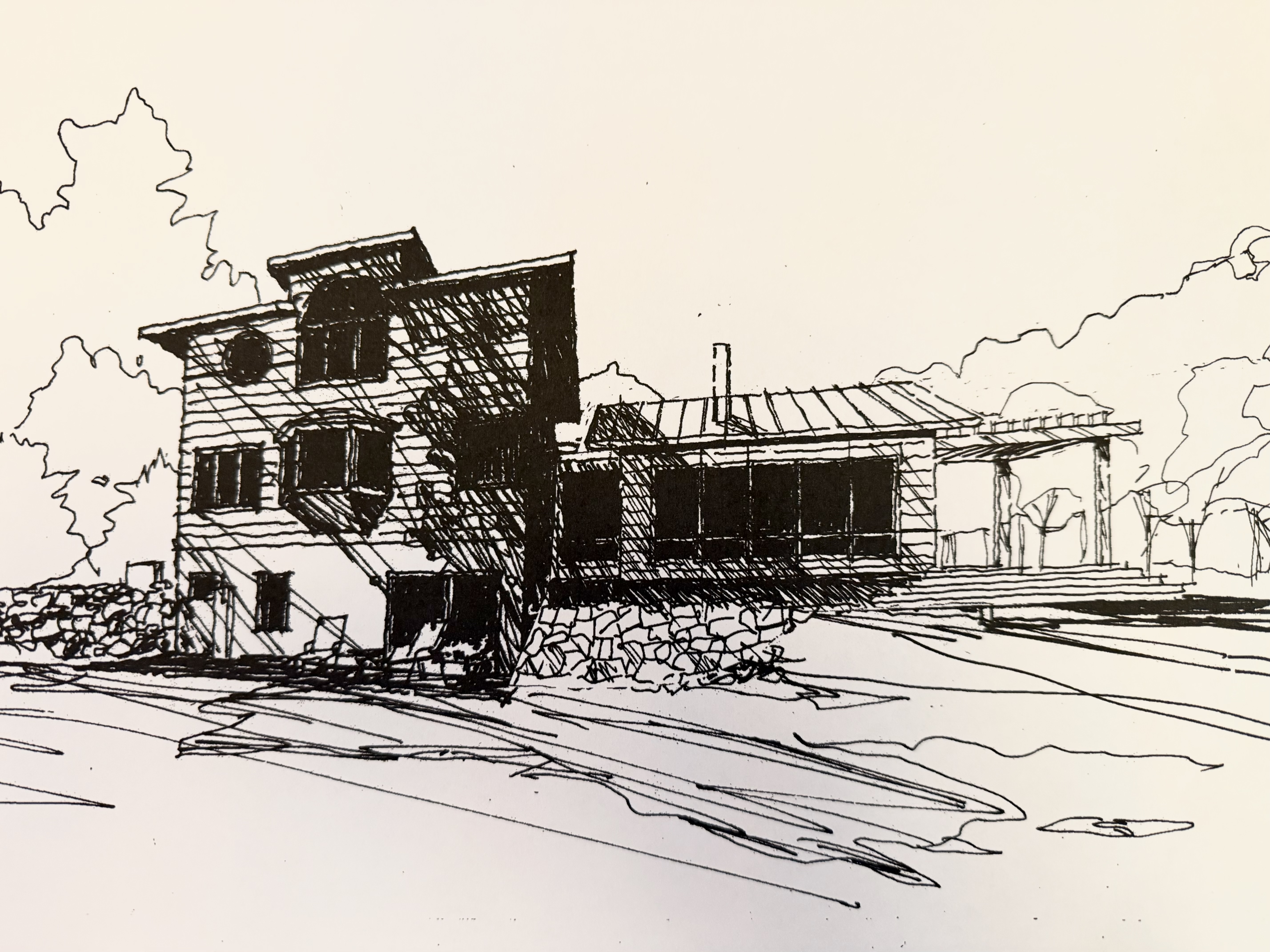 all dark siding trellis on right hand side lots of grass and landscaping in foreground