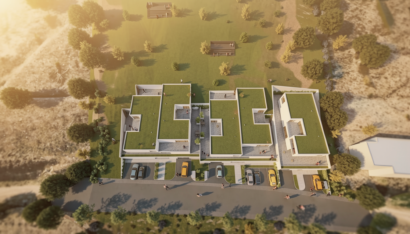 important preserve the existing geometry and the existing context exactly as provided do not modify alter reinterpret add remove scale or reshape any geometry do not change the site surroundings street layout neighboring buildings vegetation or context elements do not modify geometry scale proportions buildings road layout sidewalks or surrounding context in any way do not change text photorealistic architectural rendering clean and balanced contrast calm cinematic mood style contemporary european residential architecture minimalist premium understated include people subtle motion blur for realism make the light warmer by 30 do not add lens flare remove the lens flare