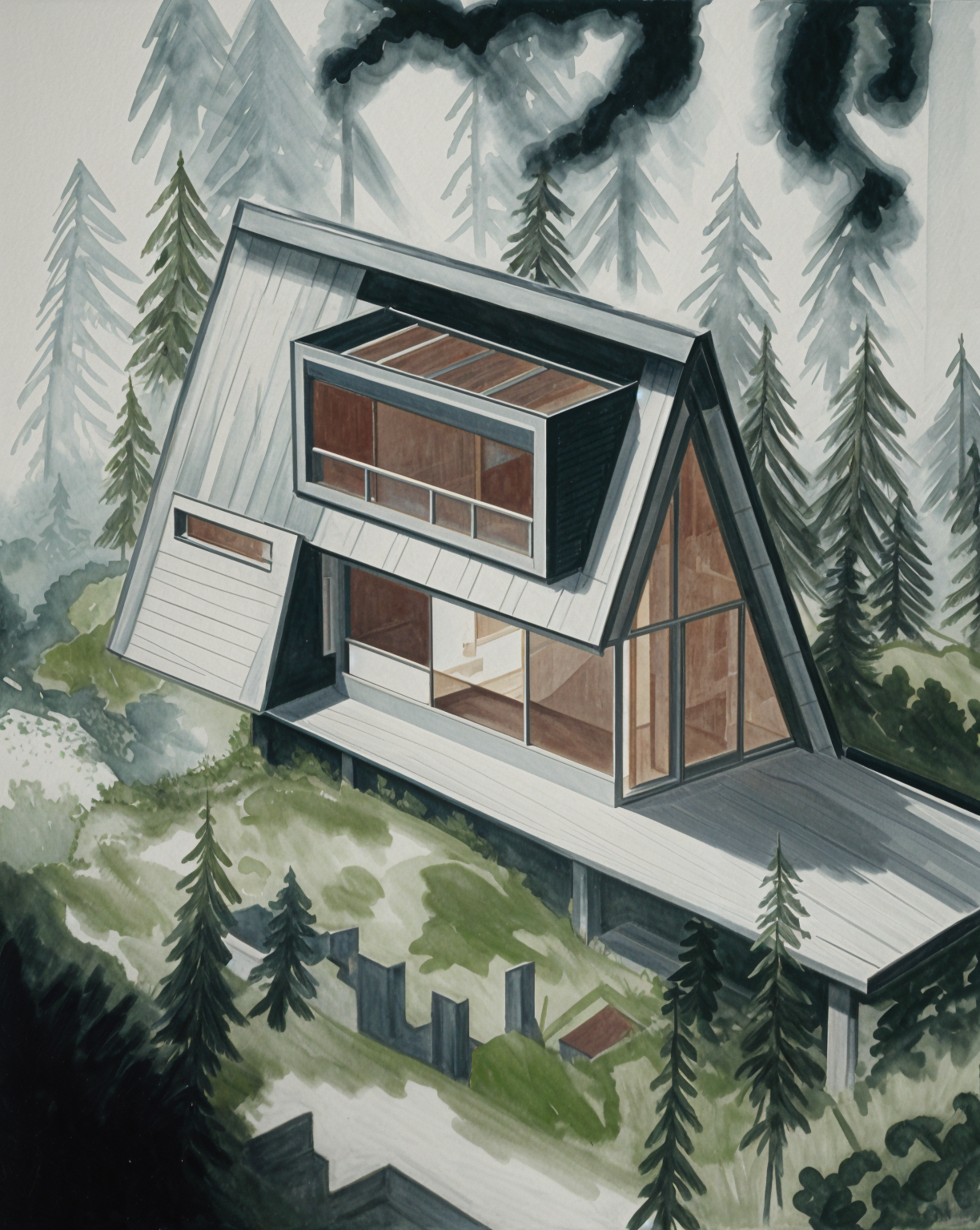 modernist exterior shot the portion of the building with 4 windows should show a material of mass timber the area with one window should show a material of light colored rammed earth and the area in between should be a dark colored brushed concrete architecture