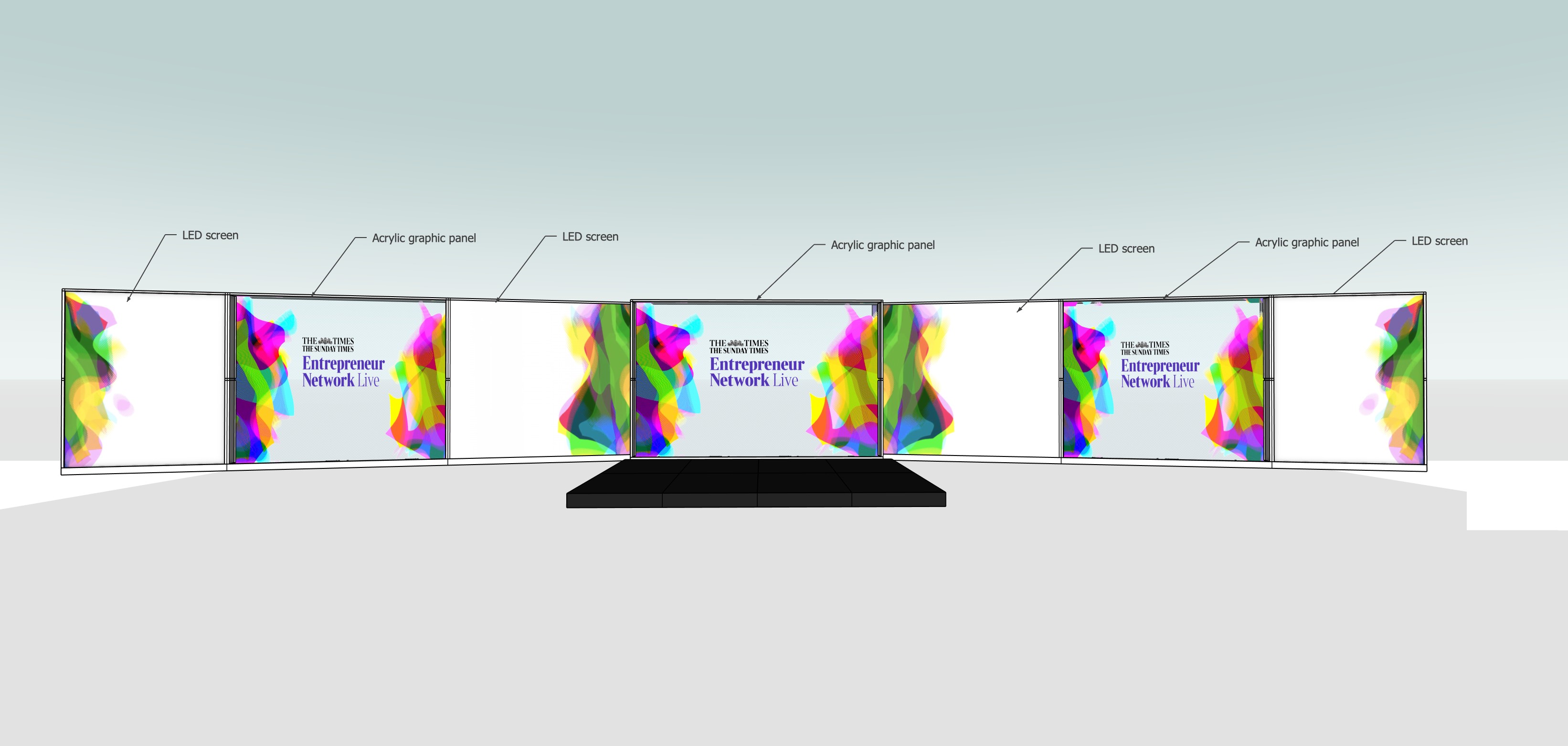 render a modern event stage setup with a futuristic atmosphere the 2 led walls labelled with annoations display smooth gradient waves transitioning from vibrant pink to cool blue creating a dynamic visual effect the podium is placed centrally made of clear acrylic exuding elegance surround it with sleek dark gray chairs 2 black stages include lush green plants for a touch of nature and ensure the lighting enhances the overall ambiance with soft white highlights the overall look should be professional yet inviting perfect for a high profile summit remove all annotations