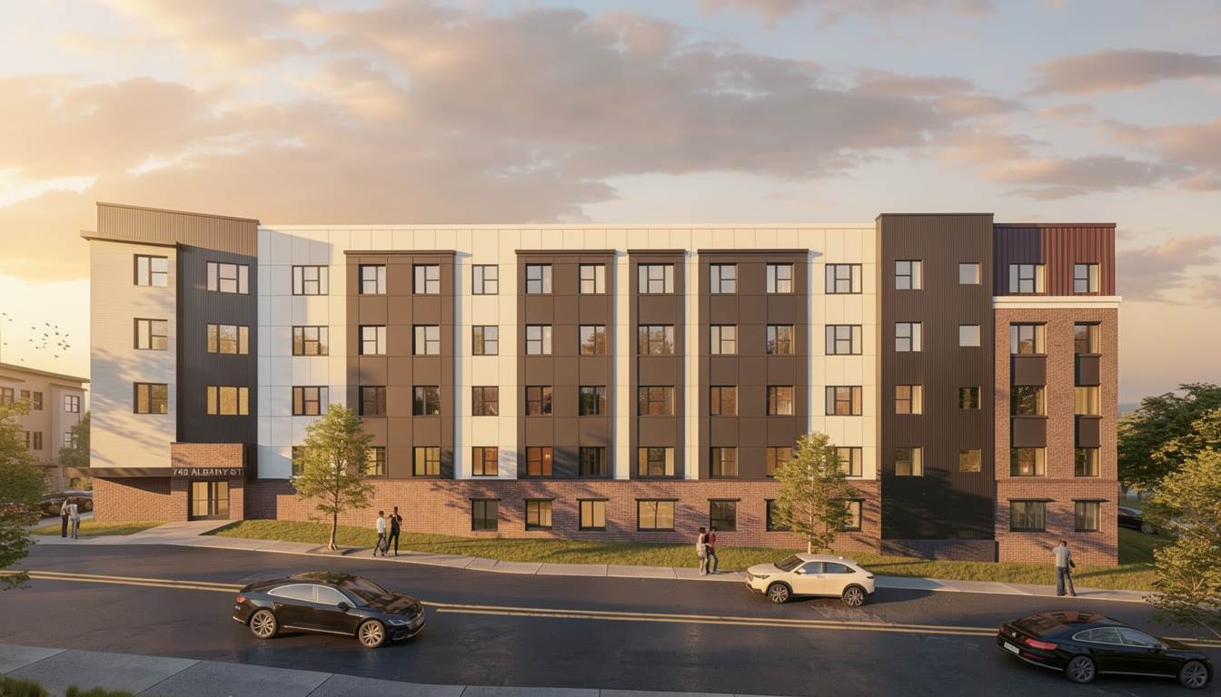 render a photorealistic 3d perspective of this house in a backyard with a simple house in the background reference the current material style just enhance them keep model geometry the same windows doors roof walls garage door make a grassy vegetation and young leafy trees do not change the view only enhance the current materials and make the landscape nicer vegetation detailed textures in the wood siding and glass reflections and a vibrant clear sky with light atmospheric depth render in hyper realistic architectural visualization quality 8k resolution add a concrete driveway at the garage door