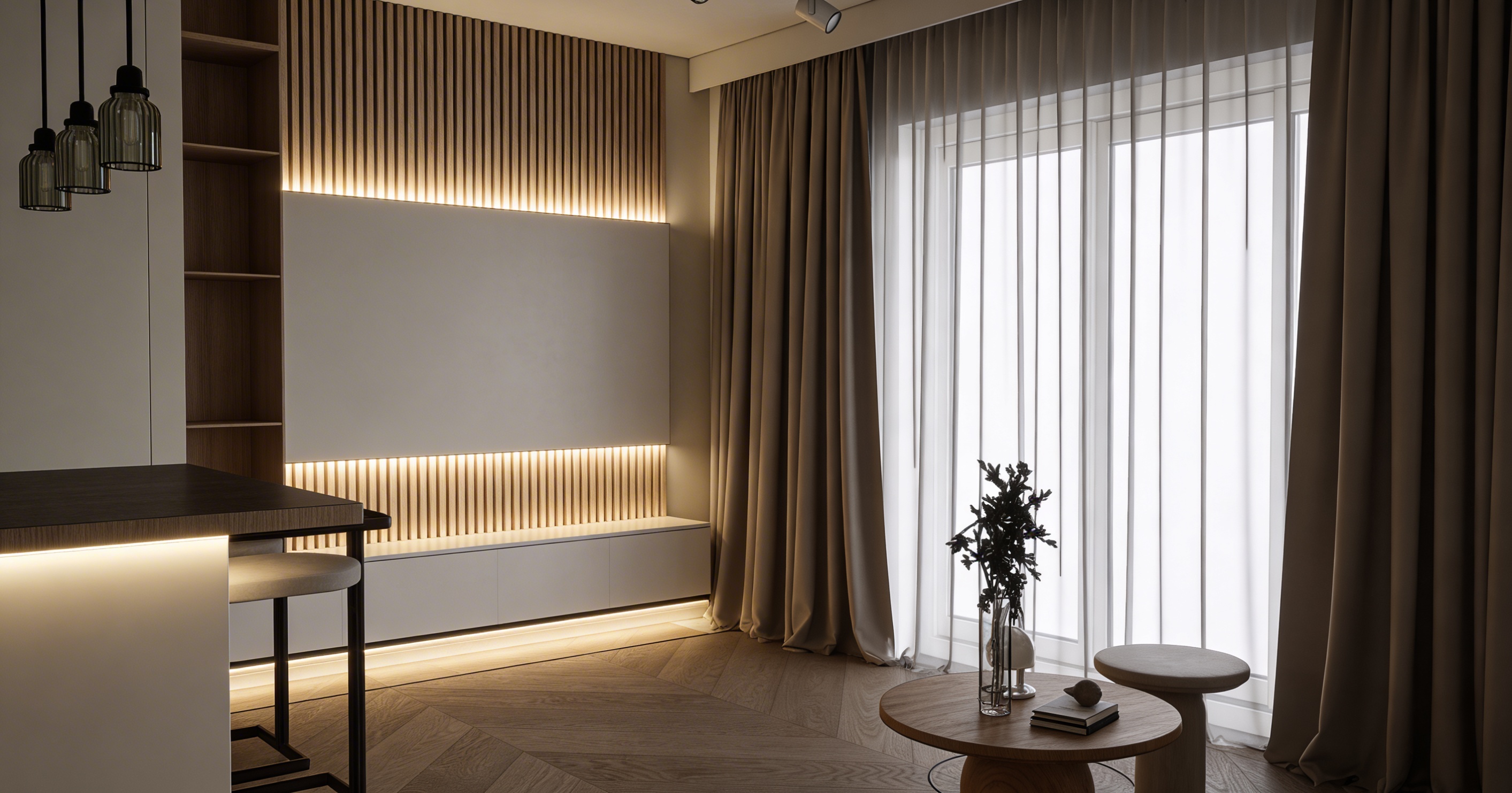 project custom swiss residential kitchen in a modern single family home timeless bespoke carpenter kitchen with island and full height cabinetry camera critical frontal view of the kitchen island eye level camera perfectly centered neutral architectural photography geometry strict lock do not alter geometry must exactly match the reference image no added or removed elements island with seating niche in foreground sink under window full height cabinet wall right floating oak shelves left of window no layout reinterpretation handle logic very strict exactly two handles only positioned on the tall cabinet with ovens right side handle orientation horizontal handles only not vertical handle position aligned with oven stack exactly as drawn in the reference do not move handles handle material brushed aluminium light metallic explicit exclusions important refrigerator on the far right is completely handleless all other cabinets handleless push to open system everywhere else no additional handles no vertical handles no dark handles do not reinterpret joints as handles do not invent hardware materials high fidelity cabinet fronts super matte lacquer formex twill tone warm neutral white ral 9010 range countertops and island cladding natural stone granite nero pretoria dark grey to deep black fine grained homogeneous flamed and brushed finish matte slightly textured velvety crystalline surface very low reflectivity sharp edges with subtle micro bevel monolithic slab appearance backsplash matte white ceramic seamless shelves natural oak lightly oiled coffee machine black with chrome accents right side countertop bar stools white seats wooden base floor light grey mineral floor fine mottled structure subtle satin sheen fixtures appliances brushed stainless steel sink and faucet two v zug ovens black reflective glass oven handles matte black walls envelope walls and ceiling soft neutral white mineral matte white window frames craftsmanship precise joints and calm layout flush appliance integration clean material transitions no visible fixings lighting mood natural daylight from large window soft shadows bright airy swiss interior calm minimal high end carpentry quality rendering style photorealistic architectural visualization maintain colors and proportions no showroom styling no exaggeration material authenticity priority anti drift lock critical respect reference image exactly handles must remain horizontal no extra handles anywhere refrigerator must stay handleless maximum fidelity to input geometry