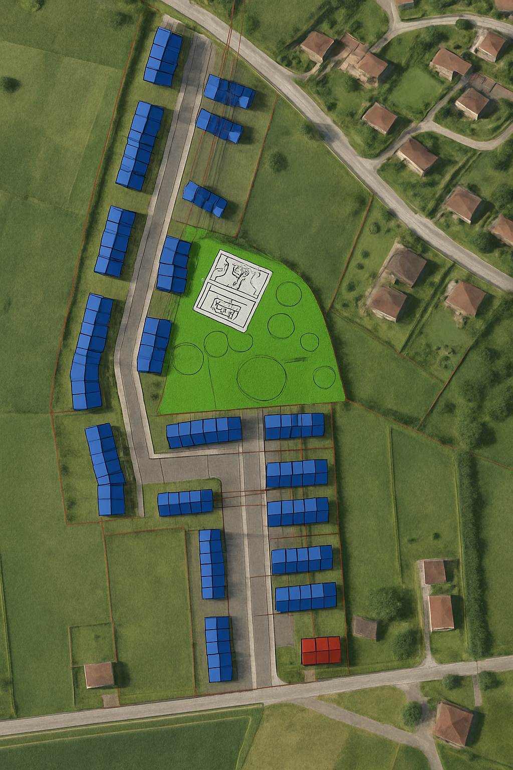 plan of new housing area with green part with basketball and small footbal field inspired with burle marx landscape
