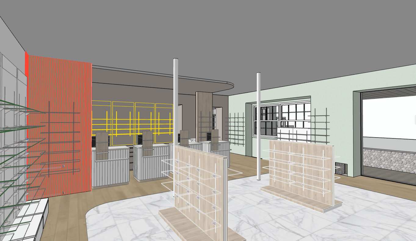 art nouveau exterior shot interior of a modern pharmacy with a natural atmosphere warm and welcoming design featuring oak wood tones sea green accents and pebble grey details central display units in white and light wood combining clean minimalism with organic textures counters with a natural wood look flooring made of a mix of marble and oak wood creating a refined yet comfortable space soft artificial lighting suitable for a pharmacy complemented by gentle spring sunlight filtering through the windows high quality realistic rendering balanced composition focus on natural materials modern retail interior design product on selfs people inside architecture