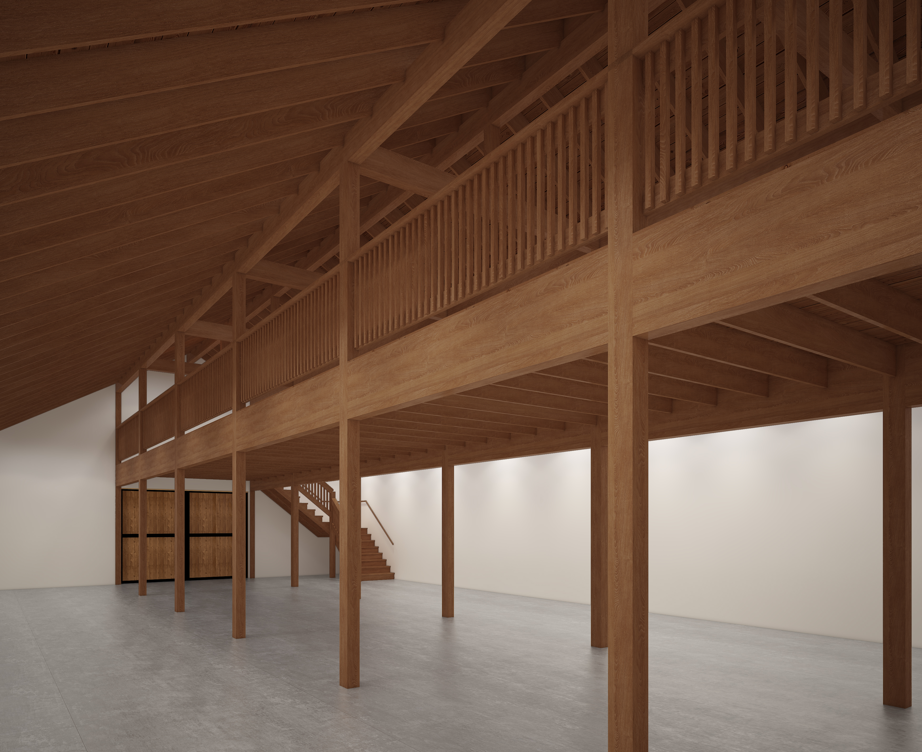cinematic photorealistic warm timber garage interior transformed into a wide angle architectural space with natural wood ceiling planks a raised center aisle 2nd floor smooth concrete flooring softened by subtle warm reflections soft daylight filters in creating realistic light falloff gentle shadows and a calm contemplative atmosphere unusual for a garage setting ar 16 9