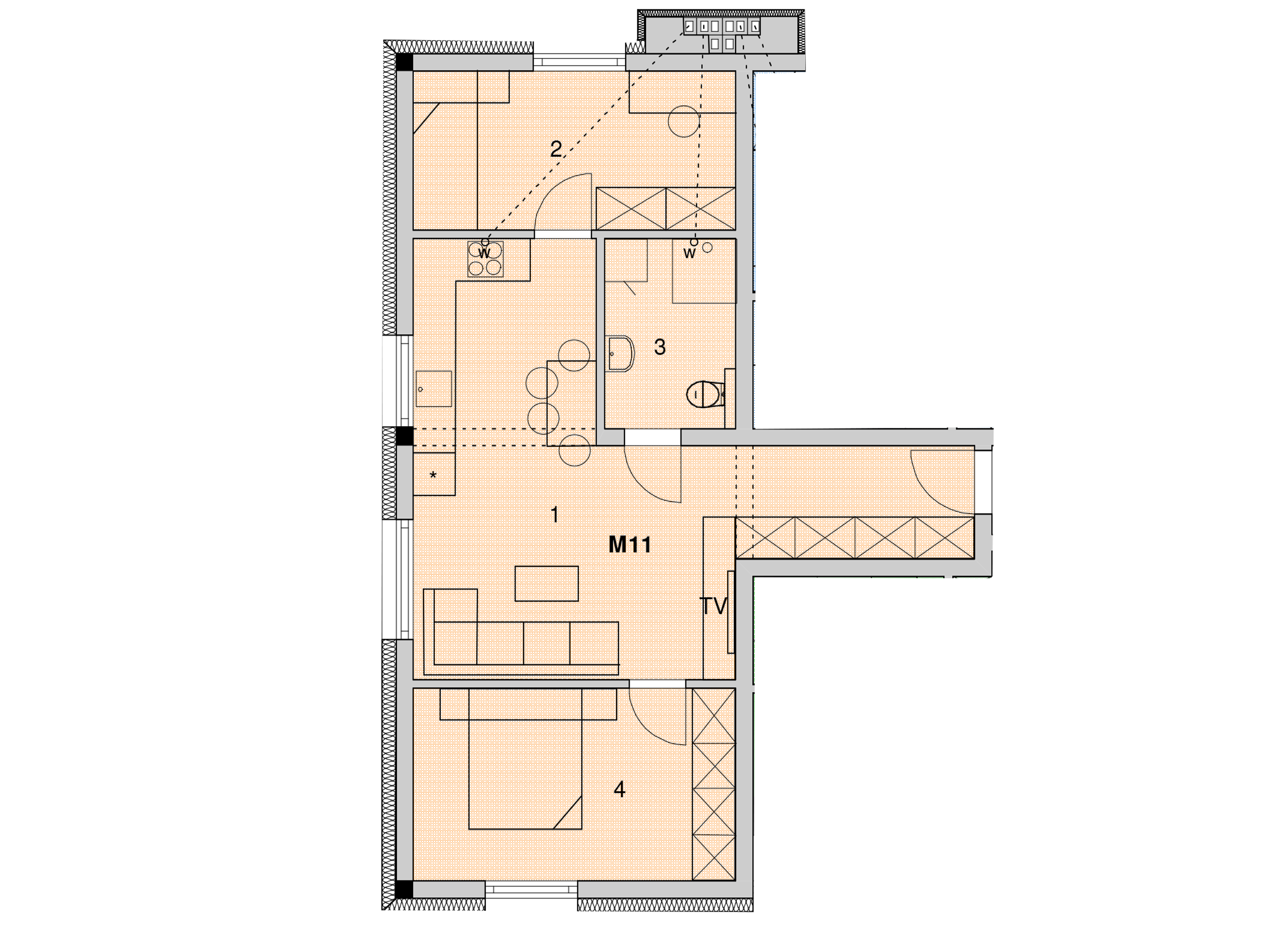 convert this floor plan into a realistic isometric 3d view of a full house show the space from an elevated angle with furniture walls and details visible a modern apartment floor plan rendered beautifully with a warm inviting atmosphere use soft orange for the flooring light gray for the walls and white for the trim and doors highlight the furniture and fixtures in a sleek minimalist style with neutral colors like beige and light brown incorporate subtle textures to add depth and use soft ambient lighting to create a cozy and welcoming mood use the same furniture as shows on the plan do not change the orientation of the floorplan