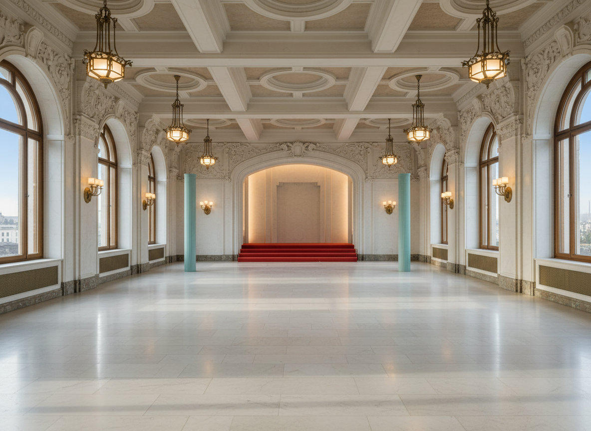 mediterranean revival interior shot keep perspective as is event room no furniture windows on the far left and far right walls featuring an elegant stage with 3 steps atmospheric backlight the room lighted with elegant artificial light all finishes in neutral tones simliar to white alabaster architecture