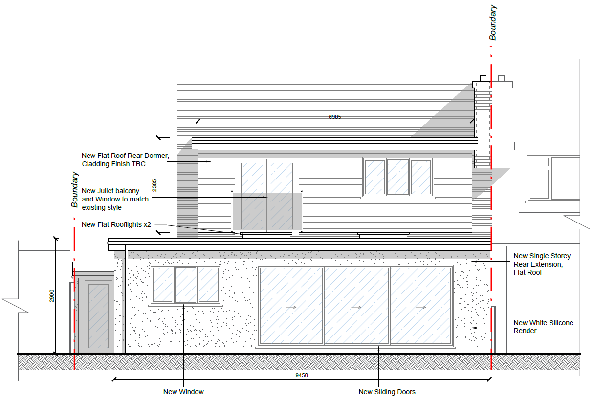 photorealistic rear elevation render of a uk semi detached house based exactly on the provided architectural drawing maintain exact proportions rooflines window positions and massing from the drawing do not redesign the house ground floor single storey rear flat roof extension with smooth white silicone render finish no brick plinth only a thin dark dpc line at base level large anthracite grey aluminium sliding doors centred one smaller anthracite grey aluminium window to the left no additional rear doors first floor flat roof rear dormer clad in horizontal arctic white cladding clean modern horizontal boards anthracite grey aluminium windows central juliet balcony with frameless glass balustrade and anthracite grey double doors roof existing pitched roof finished in plain clay tiles flat roof finished in dark grey membrane external finishes all windows and doors anthracite grey aluminium white fascia and soffits black rainwater goods patio himalayan white porcelain patio tiles large format slabs subtle light grey veining contemporary finish remove all text dimensions arrows boundary lines and annotations from the drawing do not include notes or red lines realistic british daylight professional architectural visualisation clean minimal garden setting