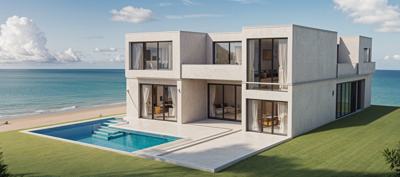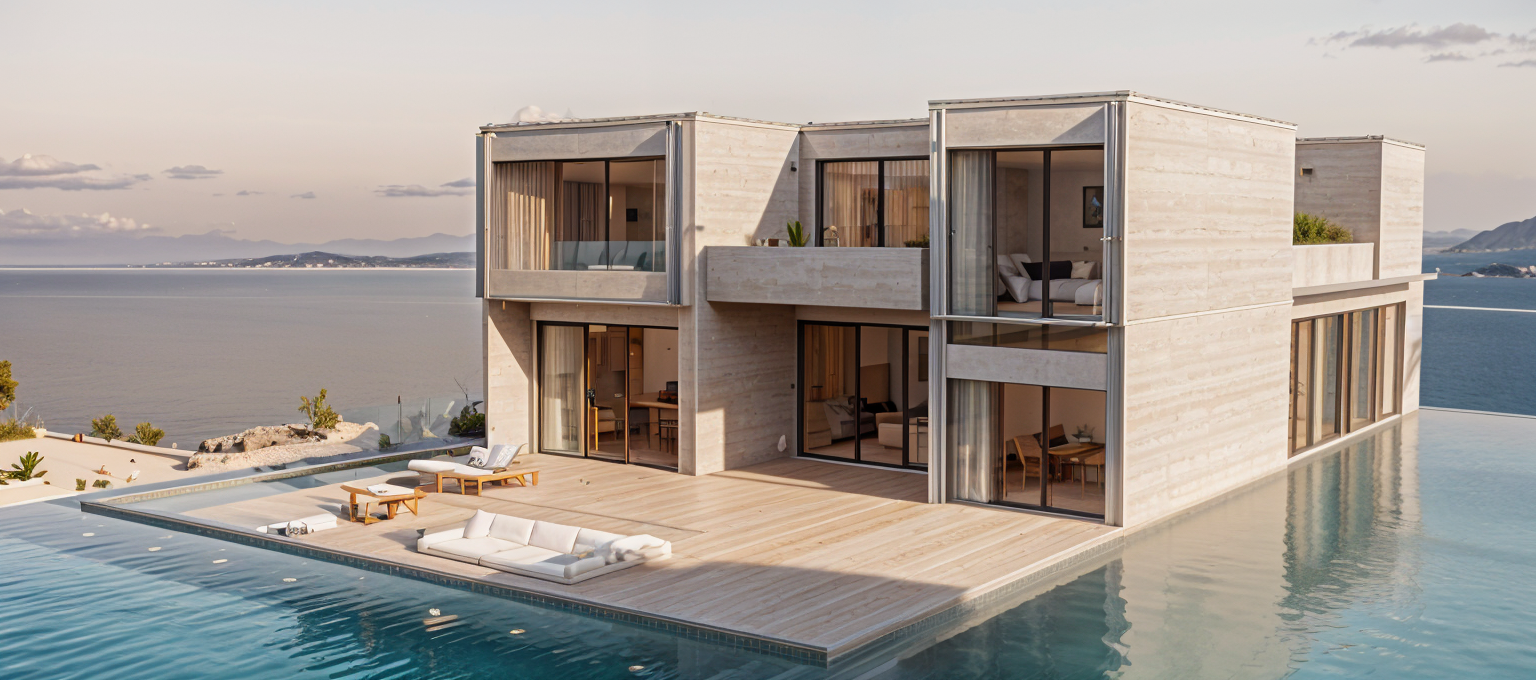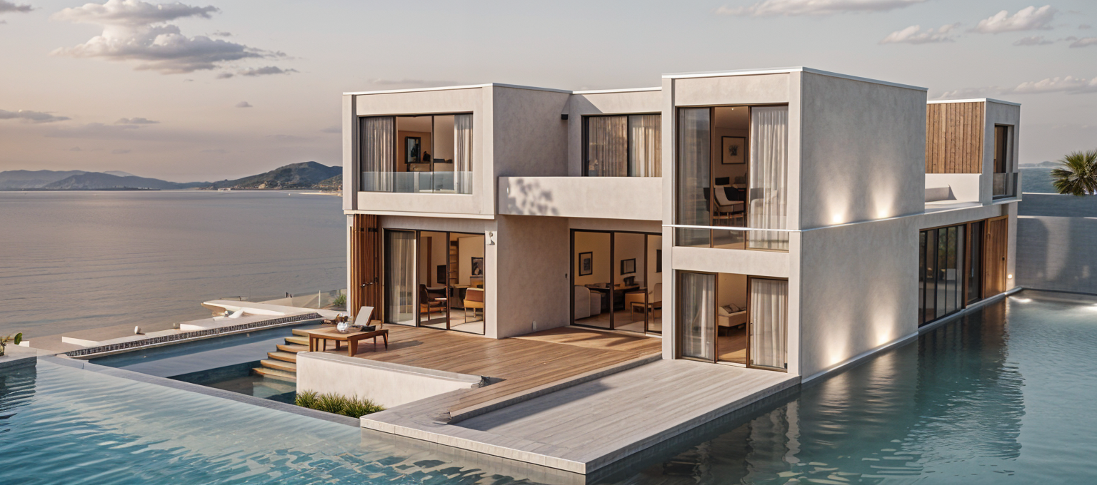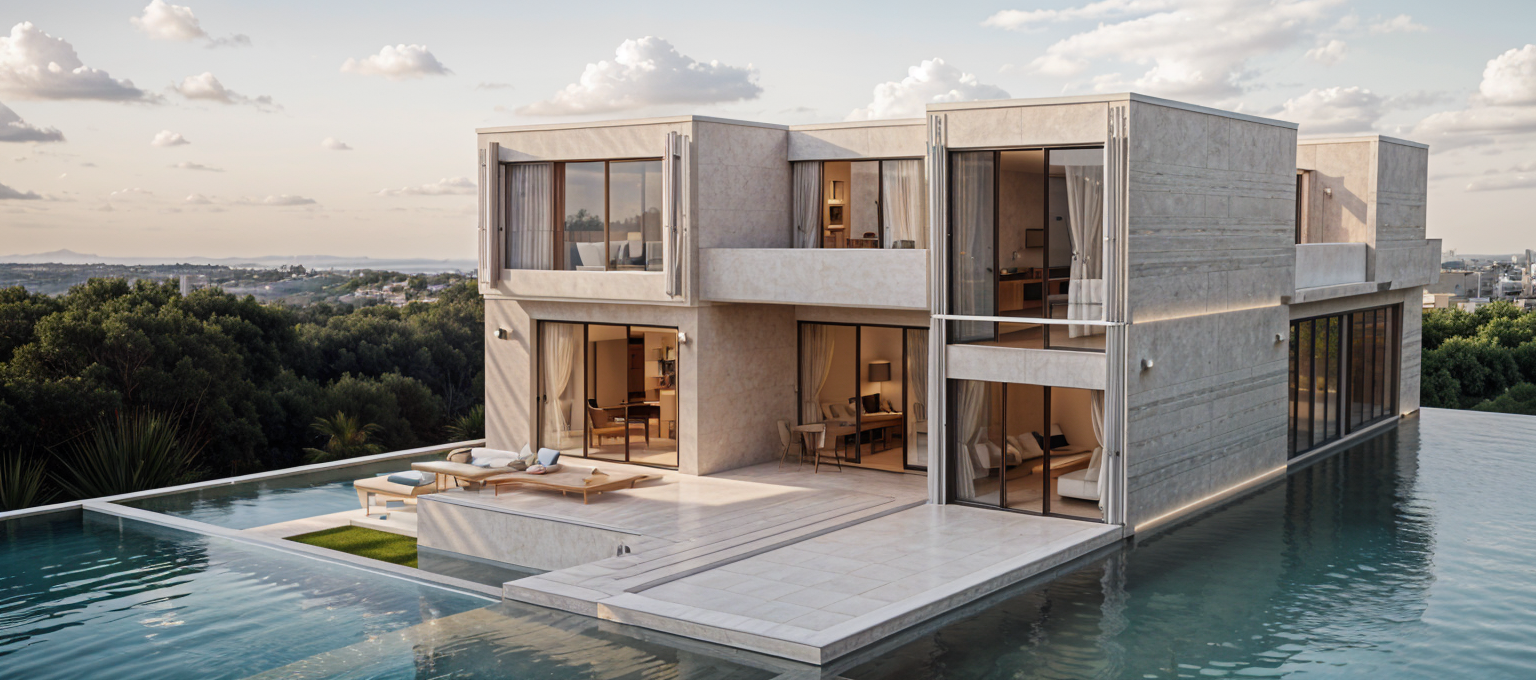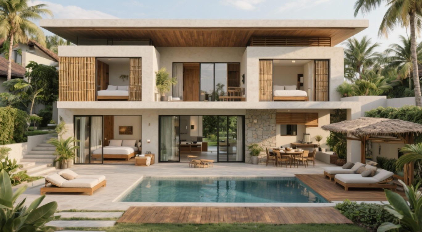 exterior shot photorealistic exterior render of a modern luxury farmhouse inspired by the reference image the design features clean rectangular volumes a flat roof warm natural materials like stone textured plaster and teak wood cladding include large glass openings sliding doors and open terraces overlooking a pool integrate lush tropical landscaping with palm trees soft greenery and natural stone pathways add outdoor lounge furniture sunbeds and a shaded pergola area for relaxation the lighting should be warm soft late afternoon sunlight with realistic shadows and reflections on water and glass the setting feels serene earthy and high end blending modern architecture with nature ar 16 9 v 6 style photorealistic quality 2 chaos 10