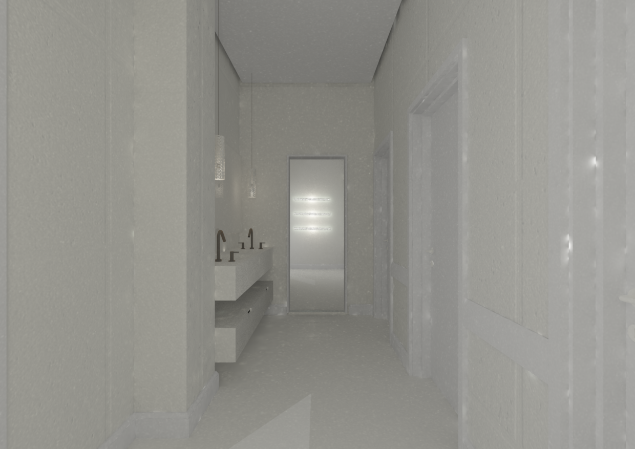 photorealistic render of a narrow bathroom corridor in an industrial minimalist style do not modify the architecture spatial layout proportions or volume in any way preserve all existing walls openings ceiling height and circulation materials and finishes walls exposed concrete texture on most surfaces right wall gray brick masonry with subtle industrial texture floor polished light concrete or stone vanity matte gray polished concrete with metalic brass frame cabinet with shelves no coverings metal elements faucets fixtures handles and accessories in brushed yellow metallic brass finish subtle and elegant mirrors and lighting back mirror fully reflective mirror surface no transparency ceiling and lighting perimetral led strip lighting integrated into the ceiling create a continuous light gap between ceiling and walls soft indirect lighting warm neutral temperature 3000k 3500k atmosphere industrial minimalist calm and refined balanced contrast between concrete brick and brass