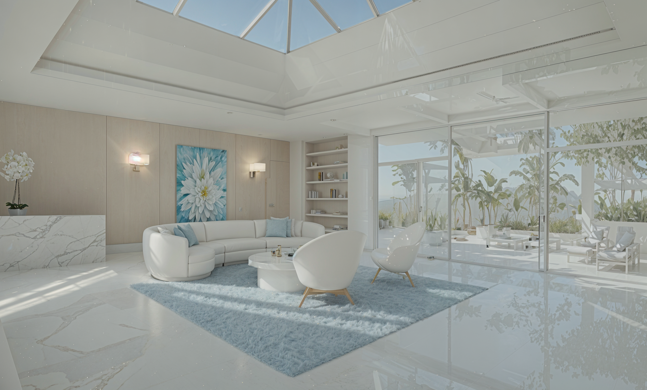 modernist interior shot add coastal style drapery to the left side windows in a four seasons meets palm beach vibe architecture