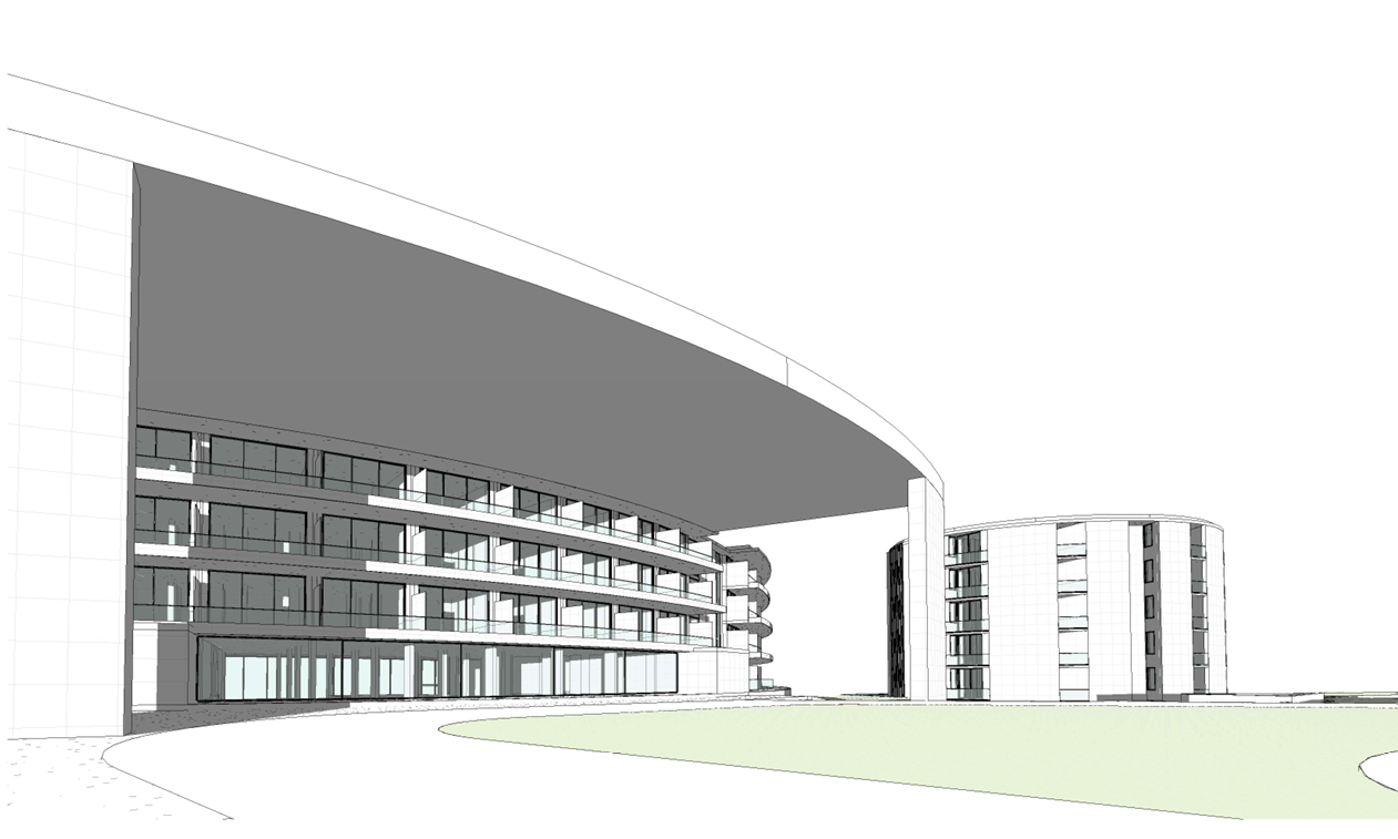 scene bright warm mediterranean hotel exterior keep the exact camera angle and exact geometry from the input no changes to forms massing proportions or layout lighting warm morning sun from the front uniform soft illumination no deep shadows remove dark shaded ceiling surfaces soft golden reflections on glass architecture do not modify architecture keep all balconies curves columns glazing openings exactly as in the input only enhance materials and lighting materials replace the dark underside of the curved roof with light beige wooden slats thin evenly spaced slats with soft sunlight passing between them fa ade materials light mediterranean stone soft beige tones clean white concrete glass bright clear reflections of sky and subtle greenery landscape minimal mediterranean greenery delicate plants only add soft low shrubs and warm grasses very subtle no excessive vegetation people add a few subtle realistic people 2 3 lightly integrated not distracting style high end mediterranean resort warm tones soft golden morning light clean elegant atmosphere restrictions do not change architecture geometry view angle or building shapes only enhance materials lighting and subtle vegetation