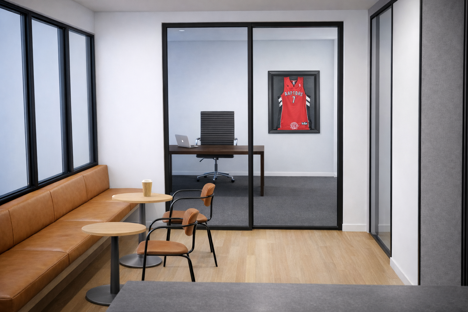 add people sitting at the table with their coffee make the room feel more real the windows behind the bench overlook and indoor basketball court