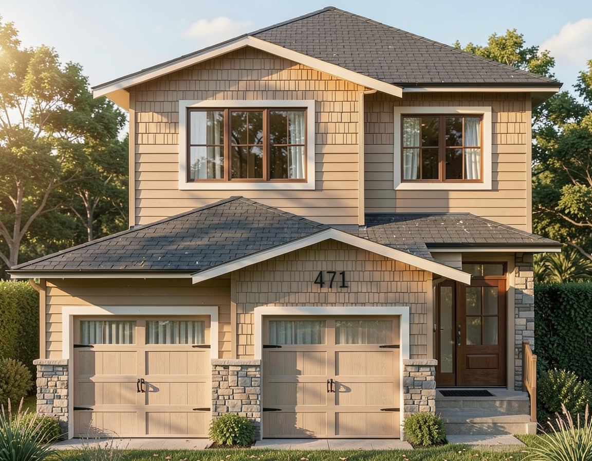 create a straight on front elevation for a renovated house with additions based on the provided floor plan keep the house size layout and proportions based on the floor plan do not change the footprint or overall massing the house should be designed in a traditional colonial style and composed of a main two story central section a one story extension on the left side a one story extension on the right side the left one story extension projects farther forward than the right extension as shown on the floor plan the three sections should look balanced and cohesive window layout the main two story central section should have symmetrical windows the main two story center has the windows to the right the main two story center has the windows to the left use double hung windows with divided grids include shutters on windows architectural details centered front door on the main two story section front entry portico with columns simple pediment above the entry white trim dark shutters dormer windows on the roof of the main section if appropriate dark asphalt roof shingles stone or a mix of stone and siding on the front facade traditional colonial proportions and detailing create a front elevation architectural drawing straight on not perspective the elevation should look like a professional architectural elevation and be proportional to the floor plan important do not change the floor plan do not change the house size the left one story extension should extend farther forward than the right one story extension the main two story section should be the visual center of the house the final design should be a cohesive traditional colonial home this should be an elevation drawing not a perspective rendering