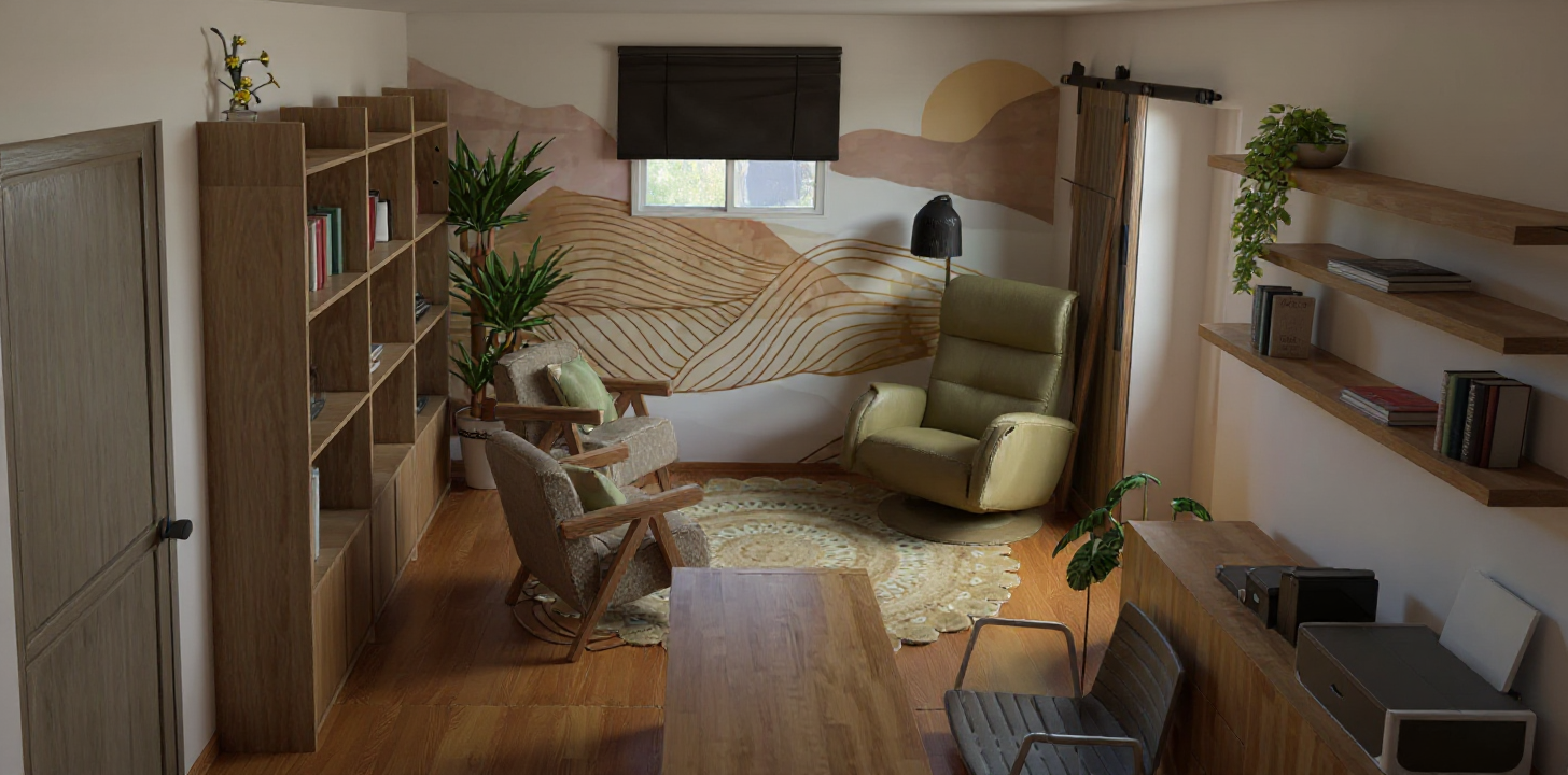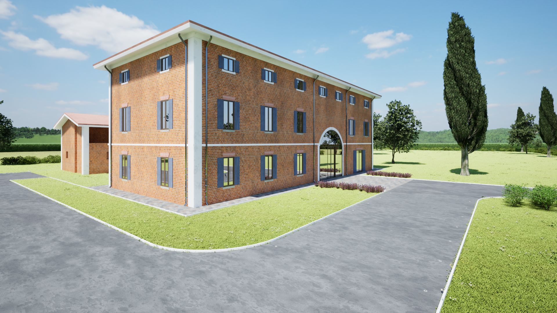 render a picturesque countryside scene featuring a three story brick building with white accents and gray window shutters under a vibrant blue sky with soft white clouds the lush green grass contrasts beautifully with the earthy tones of the building tall dark green cypress trees stand gracefully in the background adding an elegant touch the paved pathways should be a subtle gray gently curving around the building while the distant landscape features rolling green hills and a serene atmosphere