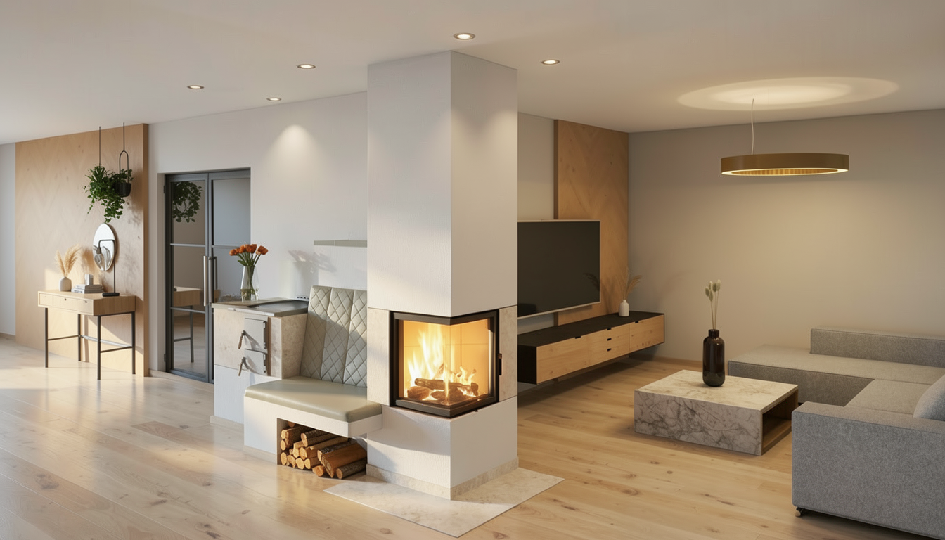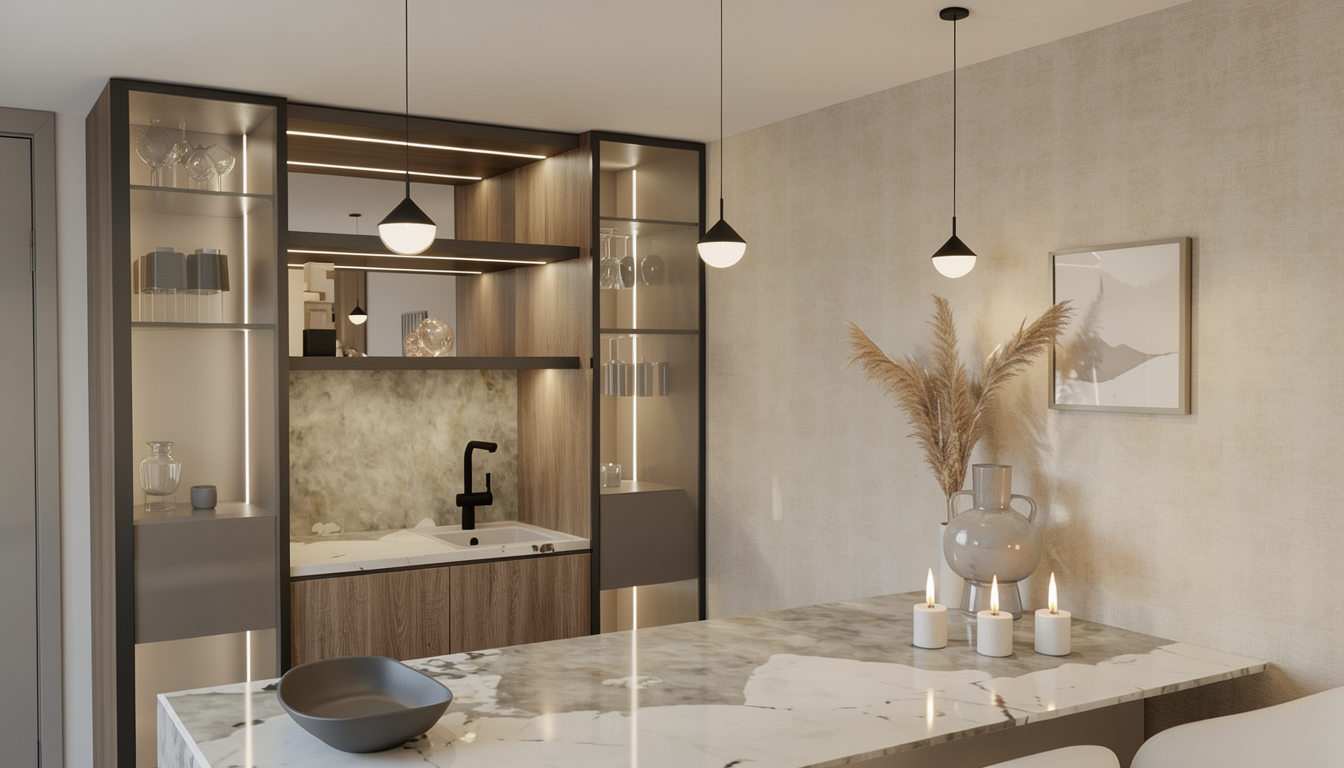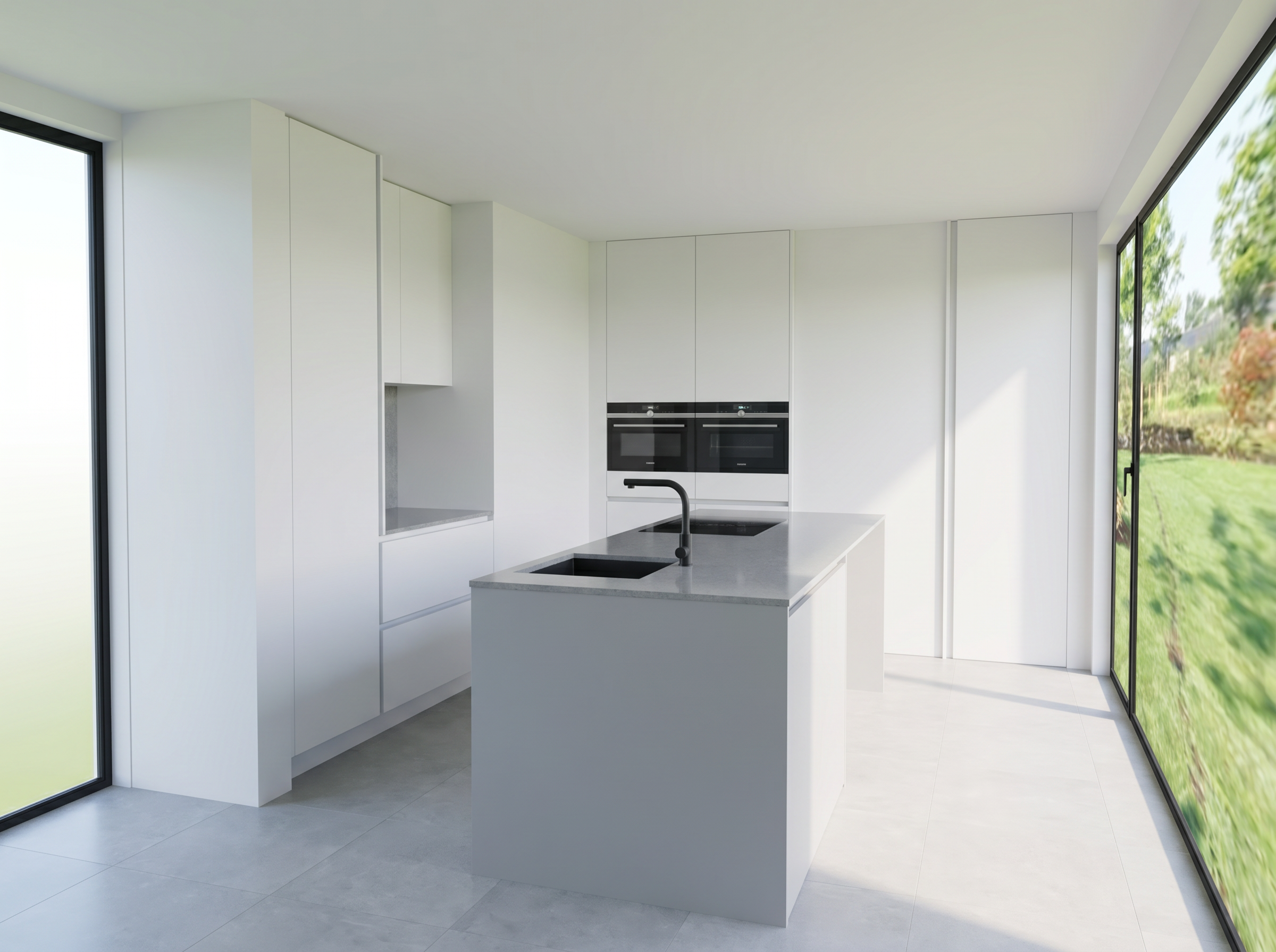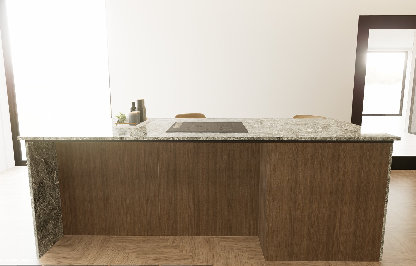 ultra realistic render of a modern kitchen island preserve the exact geometry layout proportions and materials do not change the design lighting important fix overexposure correct blown out highlights from windows reduce exposure recover details outside soft natural daylight from side openings balanced with interior lighting add subtle warm indirect ambient light to avoid flat shadows realistic contrast no white clipping no washed surfaces materials kitchen island front dark warm walnut wood with vertical grain matte satin finish rich natural variation countertop polished stone marble with high detail veining slightly reflective but not mirror like side panel darker stone with depth natural imperfections realistic roughness floor herringbone wood with realistic texture and soft reflection enhance realism add micro surface imperfections tiny scratches roughness variation edge wear improve contact shadows under island and along edges subtle reflections on countertop controlled physically accurate add realistic depth with global illumination and ambient occlusion details styling keep minimal refine cooktop surface glass reflection slight smudges for realism keep existing decor but make it premium ceramic vases subtle plant add very light shadowing behind objects for grounding camera straight on composition eye level slight depth of field for realism maintain architectural clarity no distortion render quality ultra photorealistic 4k ray tracing global illumination noise free sharp but natural